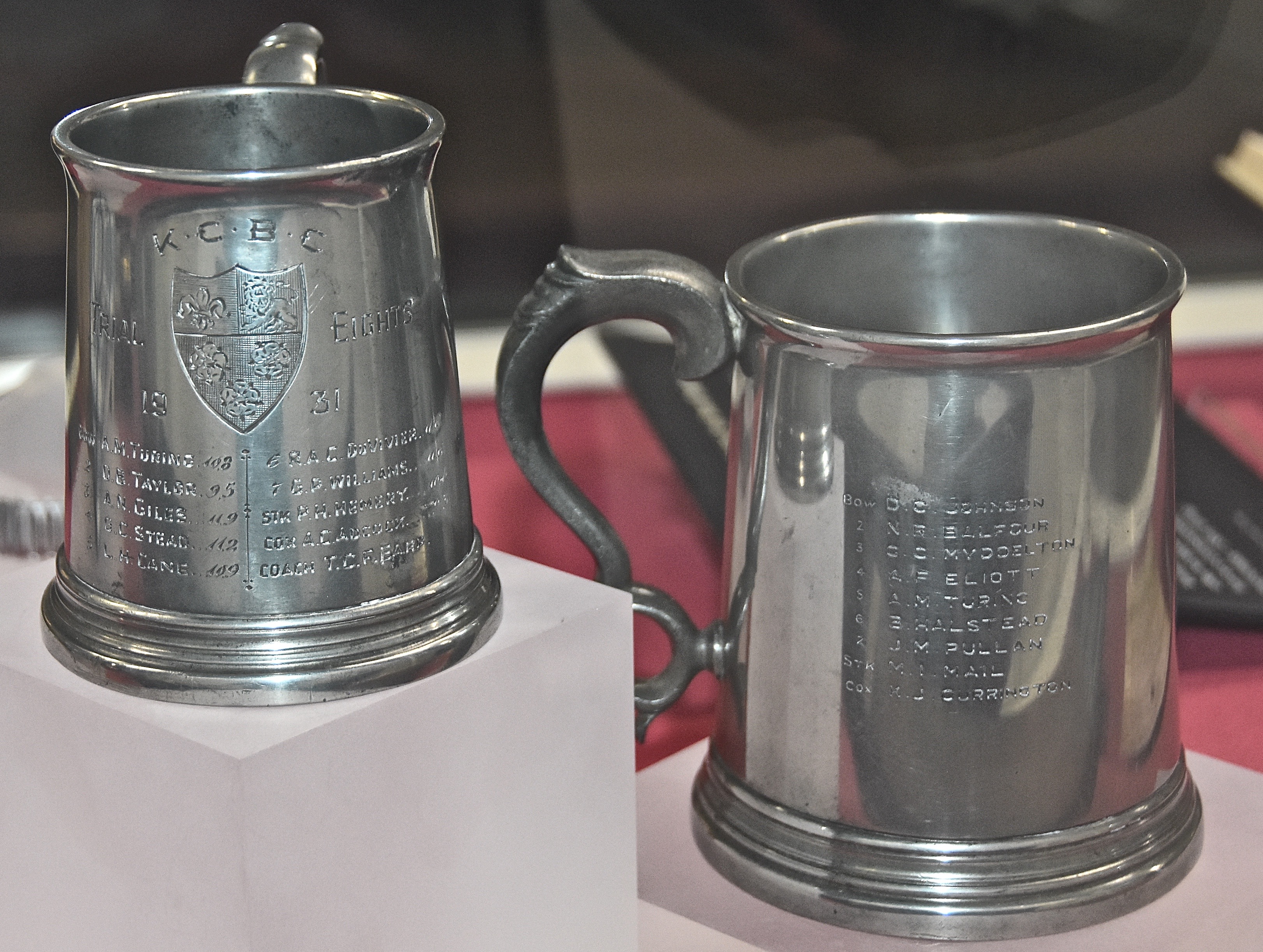 The tankards were won by Turing for rowing in the King’s Trial Eights in 1931 (at Bow) and in 1934 (at ‘5’). He was also in the 1933 Trial Eights Boat.