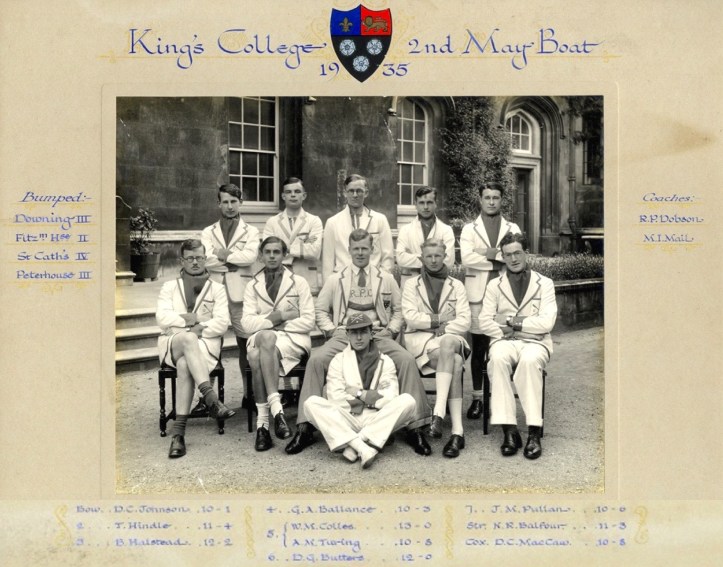 Turing (back, second from the left) and the 1935 King’s Second May Boat. They bumped Downing III, Fitzwilliam House II, St Catharine’s IV and Peterhouse III. The 66kg Turing replaced the 83kg Colles but King’s II still bumped every day.