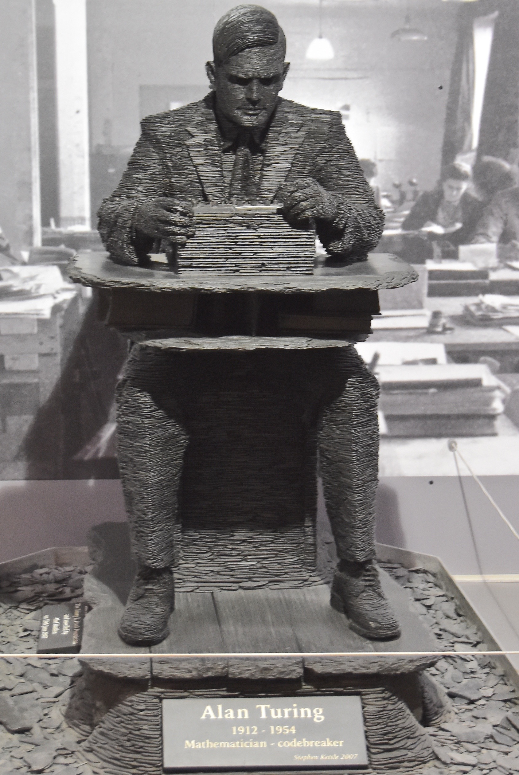 A statue of Turing made from layers of slate by Stephen Kettle that is on display at Bletchley Park.