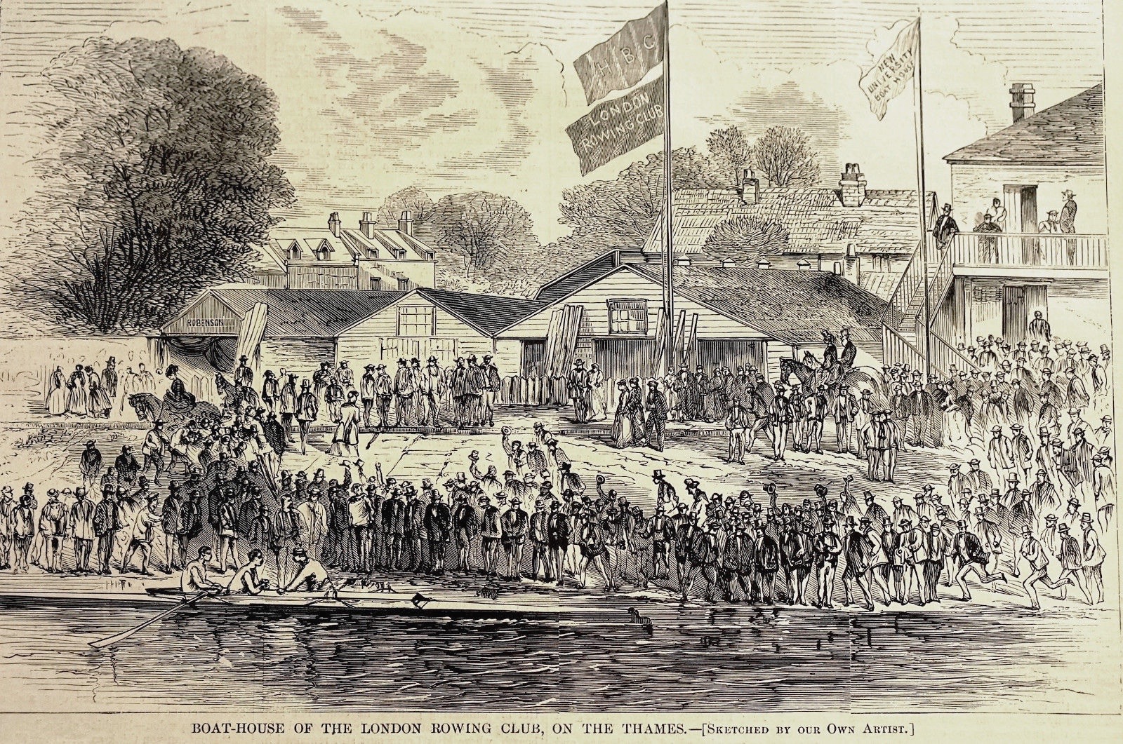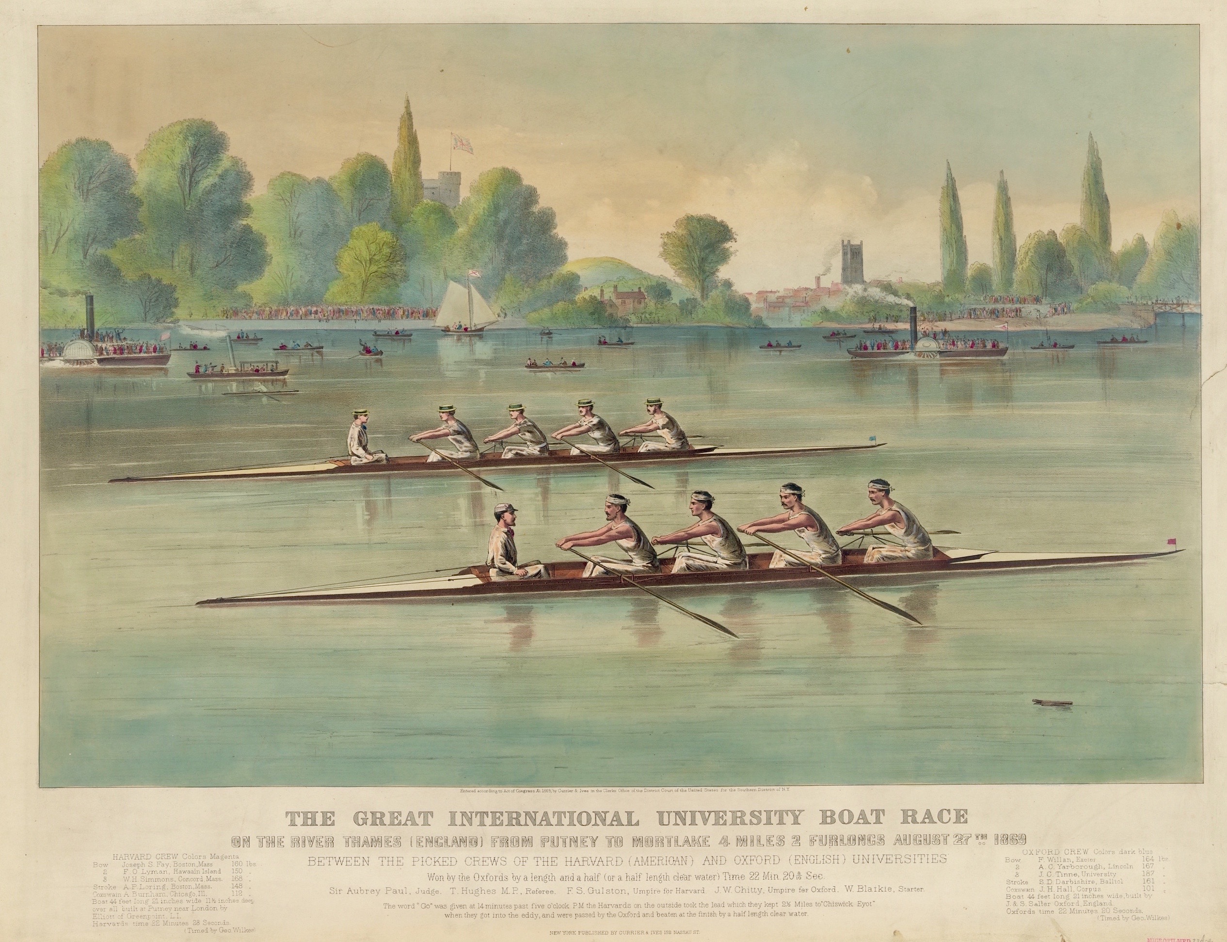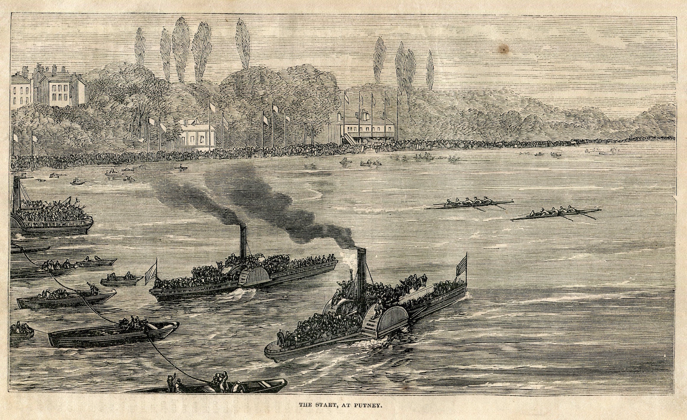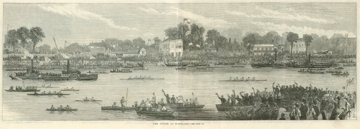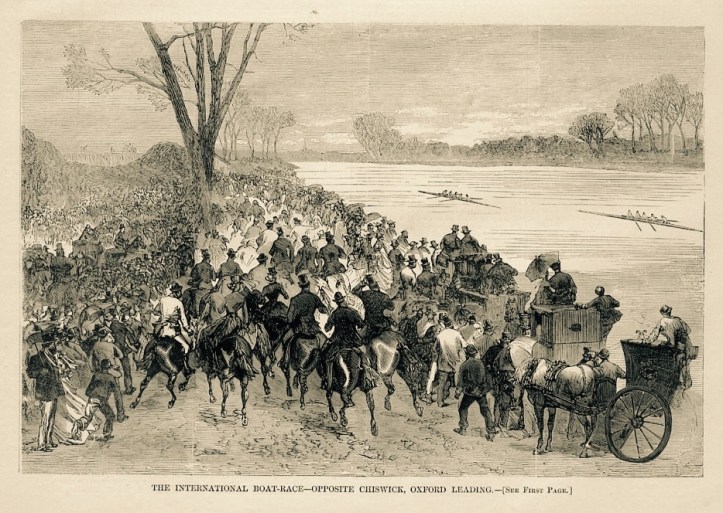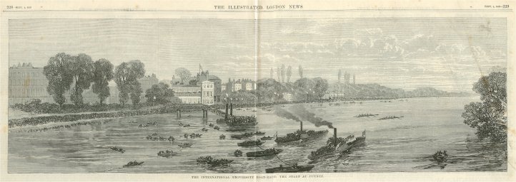At precisely 14 minutes and 16 seconds past 5 on 27 August 1869, Mr Blaikie yelled ‘Go!’, thus releasing coxed fours representing Harvard and Oxford universities from their stakeboats to race from Putney to Mortlake. The largest crowd ever assembled – estimates begin at half a million – thronged the banks and opened their lungs on the hottest day on record, and the largest assembly of reporters yet witnessed at a boat race crowded aboard the Press steamer to record the race and its result.