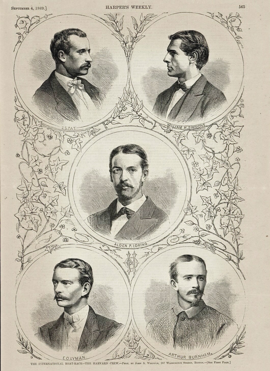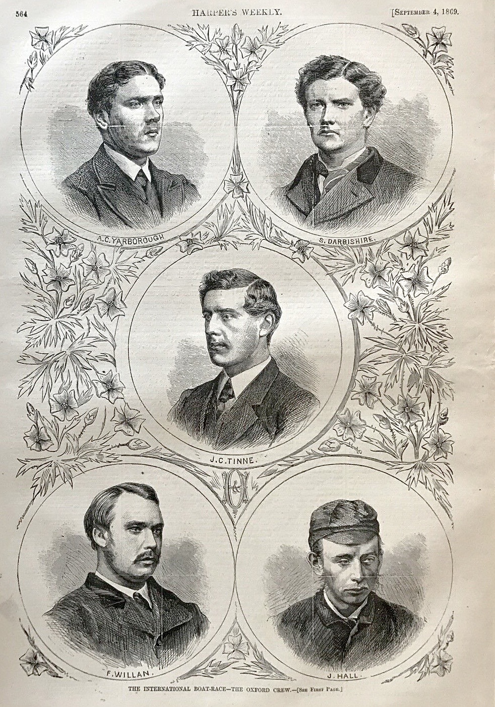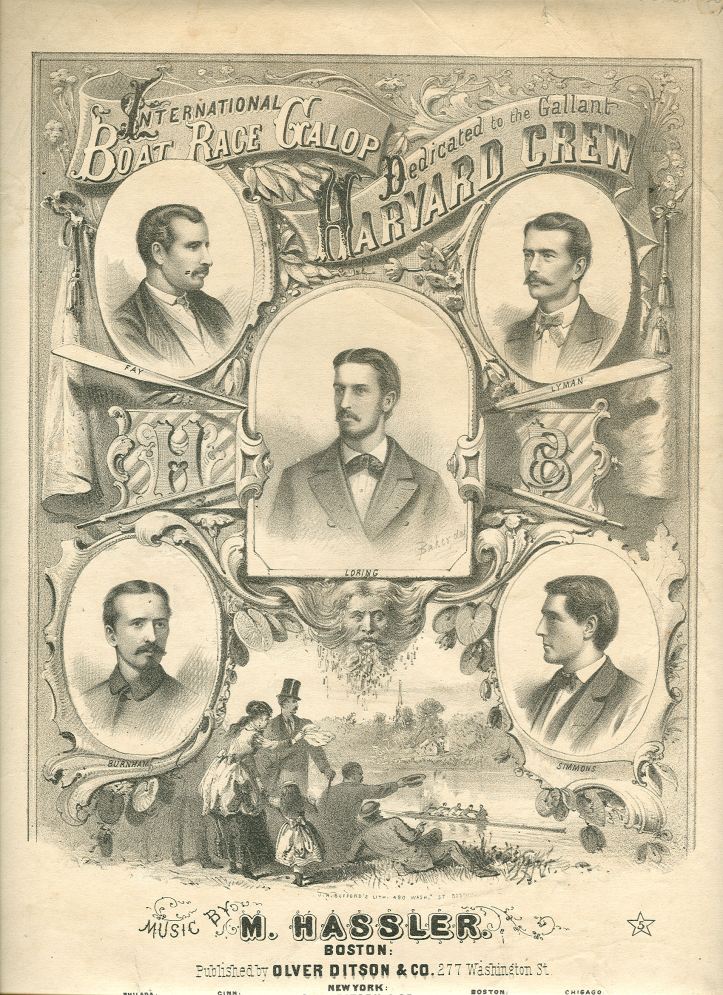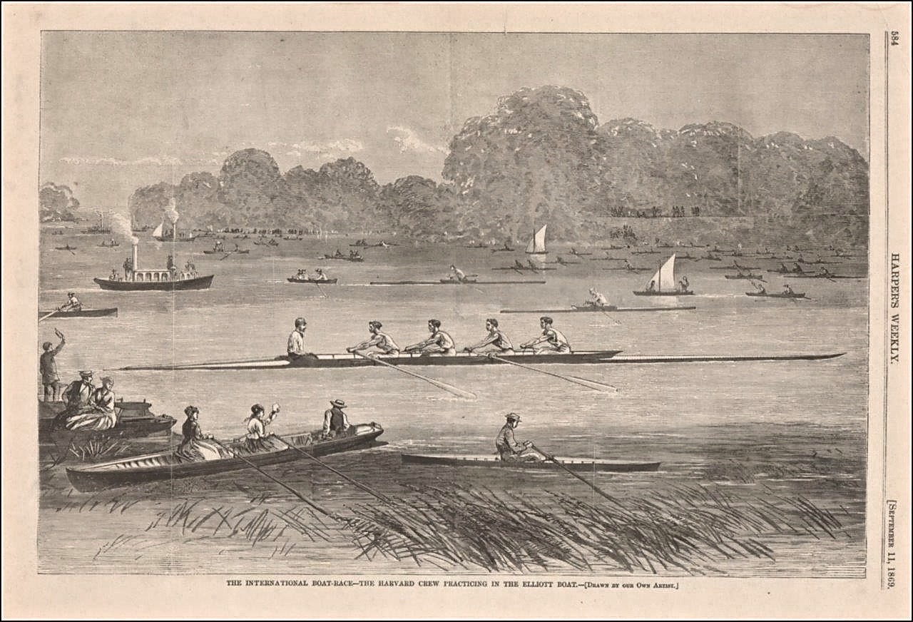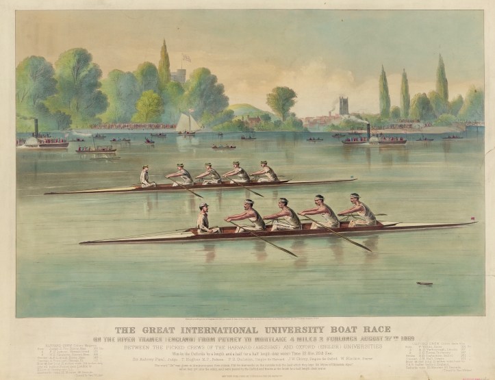 The fixture arose when William H Simmons, the captain of Harvard University Boat Club, wrote to his opposite number at Oxford, J C Tinné, on 6 April challenging OUBC to ‘row a race in outrigger boats… each to carry four rowers and a coxswain’ between the middle of August and 1 September 1869, the exact time to be agreed upon at a meeting of the crews. Tinné said Yes (Cambridge, also challenged by Harvard, declined), and Oxford began training while Harvard set about raising the money, selecting a crew and finding a boat.