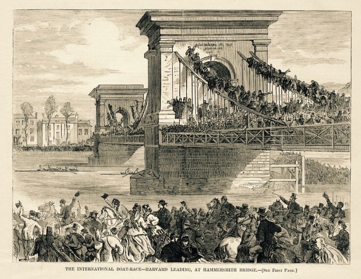 Both boats eventually sprang away almost 15 minutes after the appointed hour. They almost clash, Oxford’s Mr Hall shrieks at Harvard’s Mr Burnham, and they part, and after three minutes Harvard lead by a length and a half. Burnham then steers across the Fulham flats away from the tide, and at Hammersmith Bridge is only a length in front.