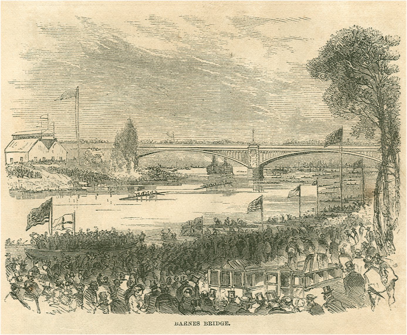 The boats are level off Chiswick Eyot and Oxford lead by two lengths at Barnes Bridge. Harvard stroke Loring is in trouble and Burnham is vigorously dashing water over him. The dense mass on the shore is swaying and sweeping over fields and fences, ditches and hedges, wild with excitement. Derby Day cannot compare.