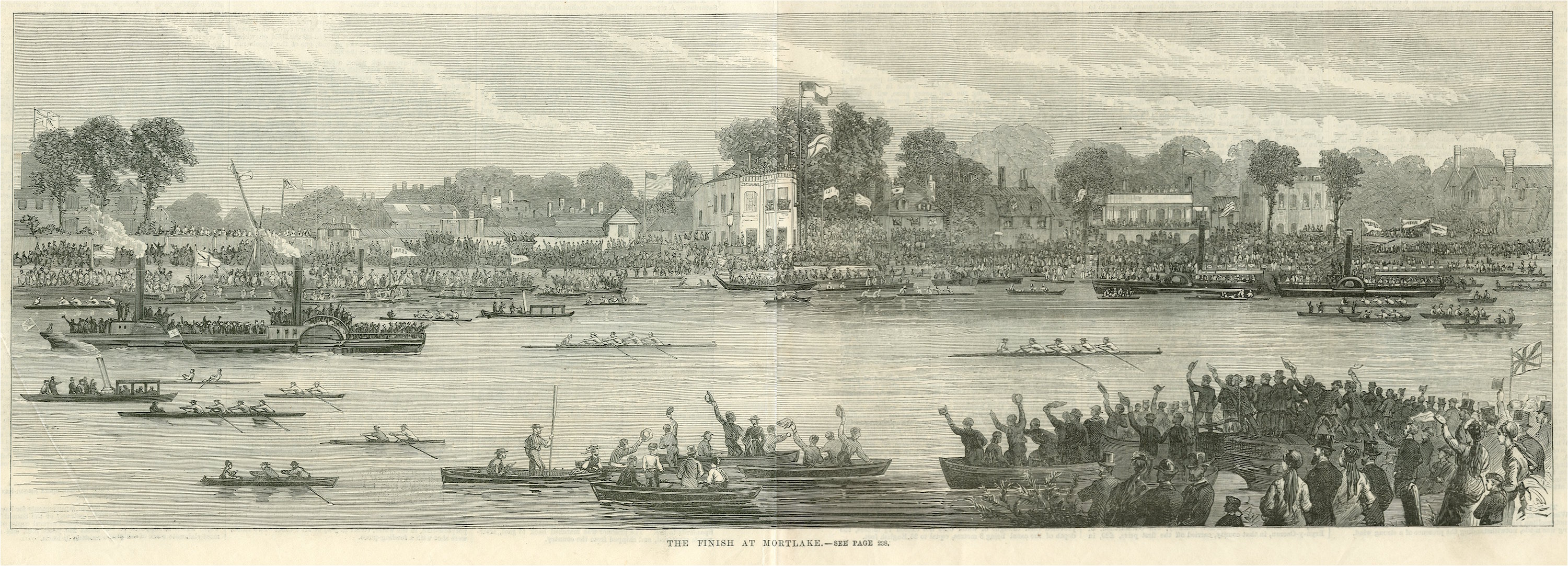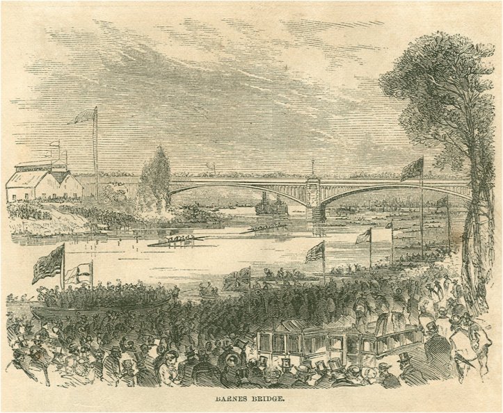 On the day, every inn, dwelling house and shanty along the Championship course was a mine of gold to its owner. Roads were blocked off, vendors and ventriloquists did their stuff, bands played the national anthem and Yankee Doodle, police boats marshalled spectator wherries and barges and 800 policemen controlled the crowd. Every by-line of note went down to the river to tackle the great challenge of a boat race – how to follow an event that moves four and a quarter miles over water from Putney to Mortlake, from one location to another.