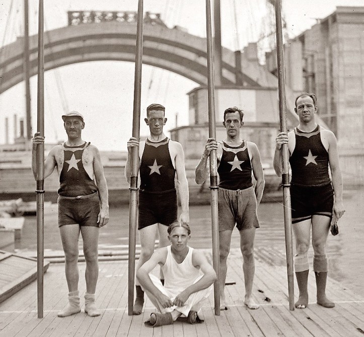 In germany a few years later, crews wearing the new one-piece gear were required on land to wear cloth shorts over them (can’t let everyone see how masculine oarsen are – no pun intended).. That was rather peculiar, since German men’s swim shorts then were all like those seen at any aquatic competiition.