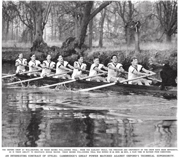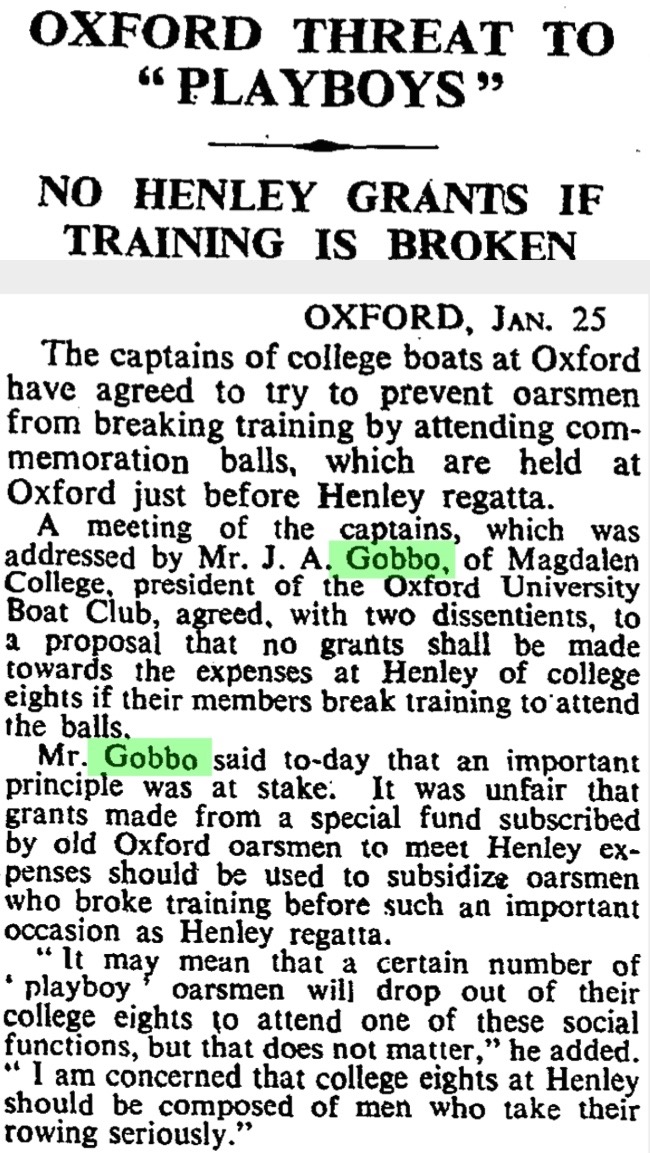 May it not be without significance that at No. 3 in the Oxford boat the oar is pulled by one J.A. Gobbo, whose family claims descent from the Venetian Gobbos… His unusual name carries a message of crucial significance for the crew. If his colleagues have consulted – as doubtless they have – their ‘Merchant of Venice’ they will have found the passage, ‘Good Gobbo, use your legs, take the start, run away’. It is particularly apposite. Legs must, of course, always be used, and not only by Gobbo. At this Oxford are better – much better – than they were a fortnight ago. But, ‘take the start. Run away!’ Just this they must do.