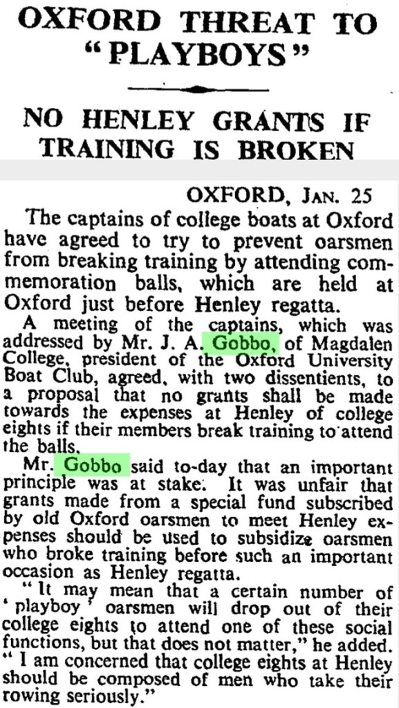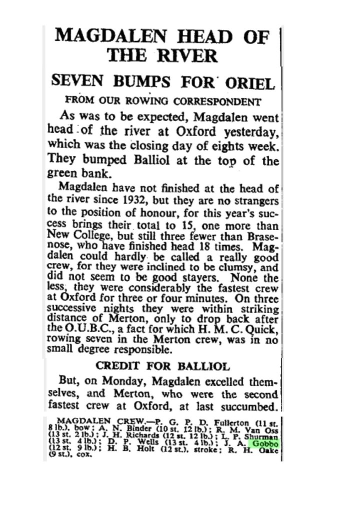 In a particularly notable piece of modesty, Gobbo does not mention that he was in the Magdalen four that won the Visitors’ Challenge Cup at Henley in 1953. The Times of 6 July said ‘Magdalen, a strong though rather rough crew, beat King’s College, Cambridge, fairly comfortably…’ Also in the crew were PGPD Fullerton, DP Wells and JH Richards. They can be seen winning the final one minute into the newsreel film below.