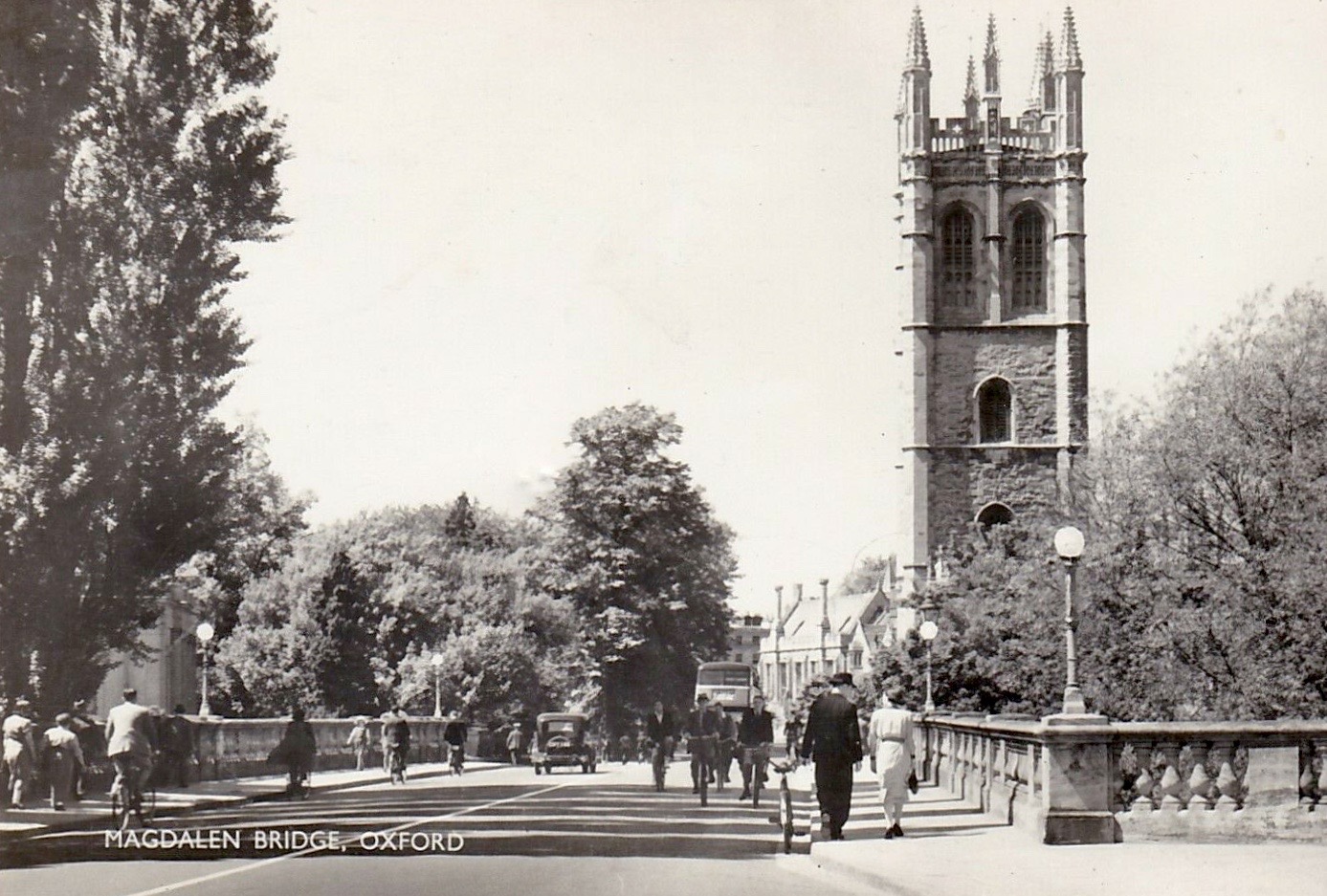 Magdalen Tower (a part of Magdalen College) and Magdalen Bridge shown in a postcard from the 1950s. It is customarily pronounced ‘Maudlyn’ (as is the Cambridge college, though this is spelt ‘Magdalene’).