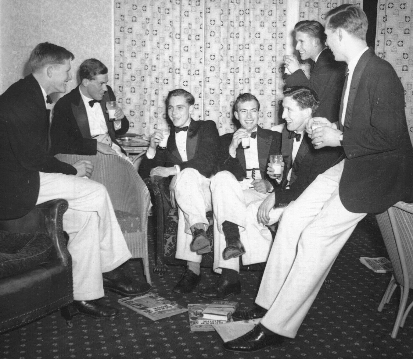 A magazine picture showing seven of the 1954 Oxford Crew ‘enjoying their bedtime milk’. Gobbo is in the centre.