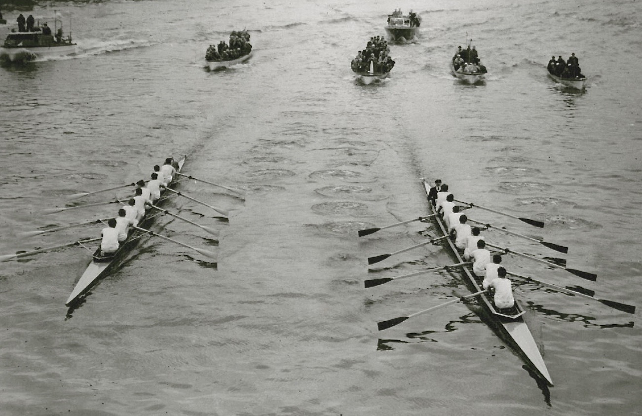 The 1954 Boat Race approaching Hammersmith Bridge. Oxford led by a canvas.