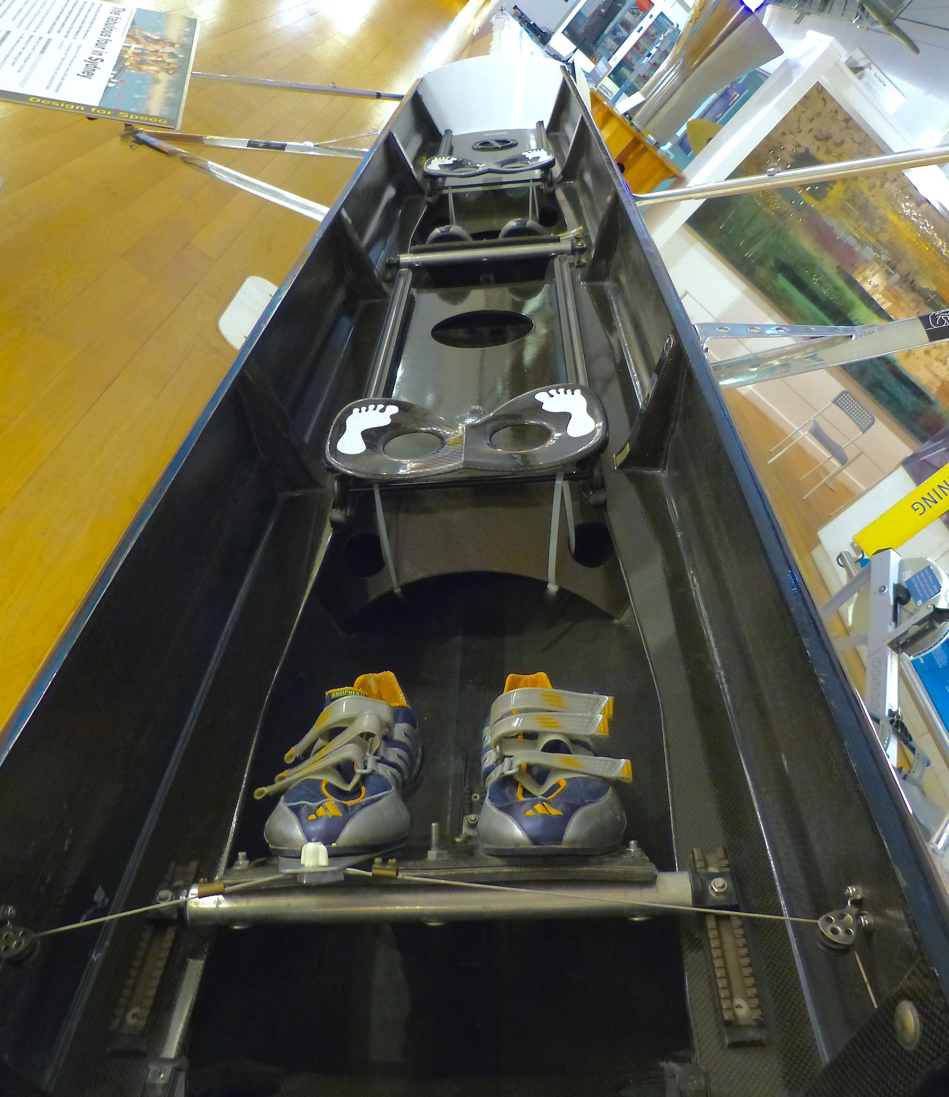 All boats in the collection answer at least one of three questions: is it a prototype, is it typical of a genre, or is it and its crew famous? Many examples are in the RRM’s store, including monocoque hulls, a 1x hydrofoil, a sculling boat in a travelling case, and a four with the cox seated centrally and rowed asymmetrically.