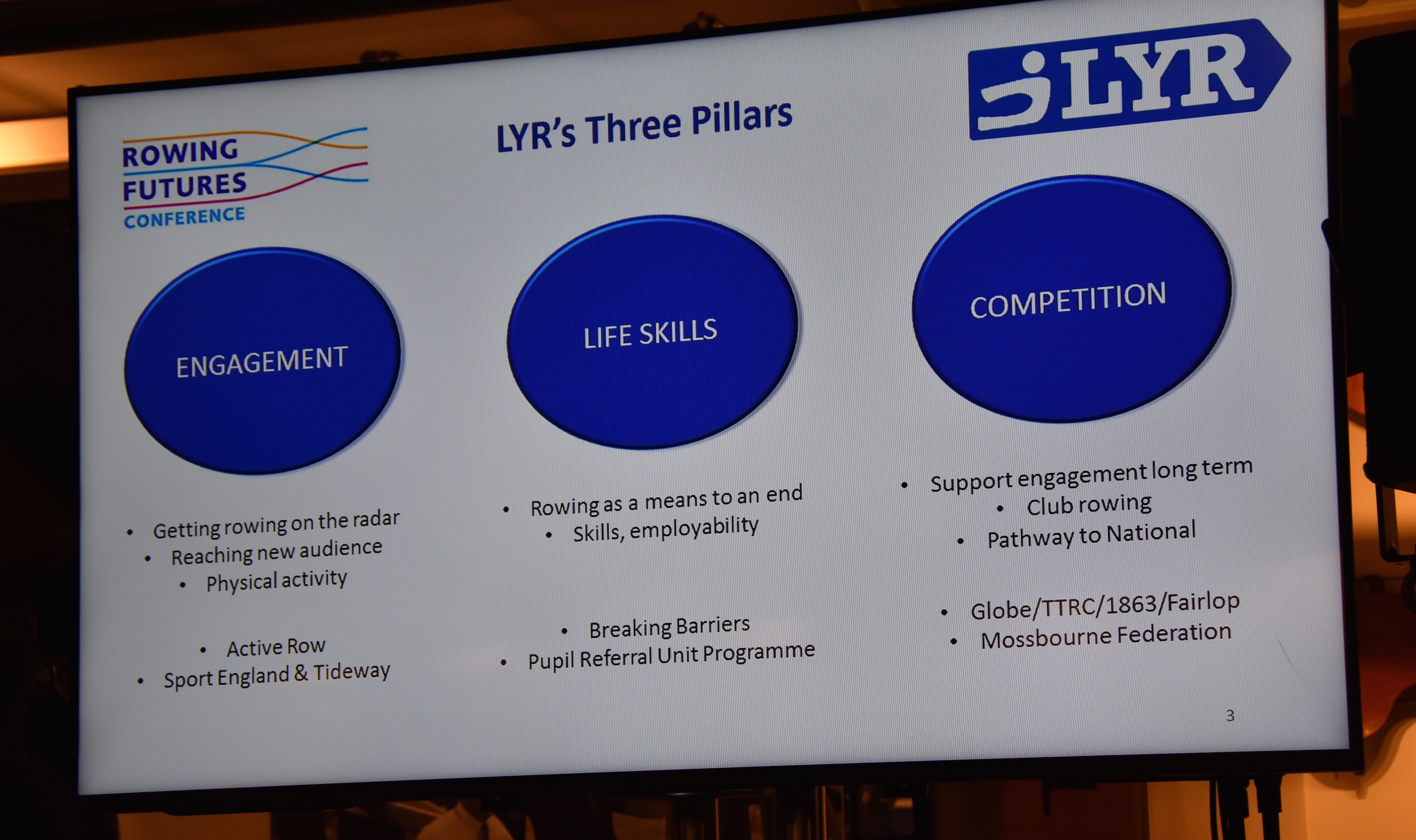 I will return to the first of this quartet later. ‘Engagement and widening participation in the sport’ may have had the least exciting title of the four, but it turned out to be the most engaging part of the day, notably because of the contributions from David Tinnion of London Youth Rowing, Steve O’Connor of Fulham Reach Boat Club, and Richard Sinnott and Ben Dunne of Warrington Youth Rowing. It was very interesting to see three organisations with one aim (which I shall paraphrase as ‘to improve young people’s physical, mental and social development by making them aware of – and giving them access to – rowing’) but with three different pathways to achieving this same end. The evangelical passion of the four people for their respective projects came across very clearly (even when they were producing dull but necessary stats and figures) and the room responded with enthusiasm to people who have a bold vision and who are making it happen.