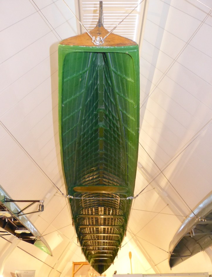 There you have in five boats the key developments in racing boat design – the inboard keel, the outrigger, the sliding seat, the swivel oarlock and the material change from wood to carbon and plastics.
