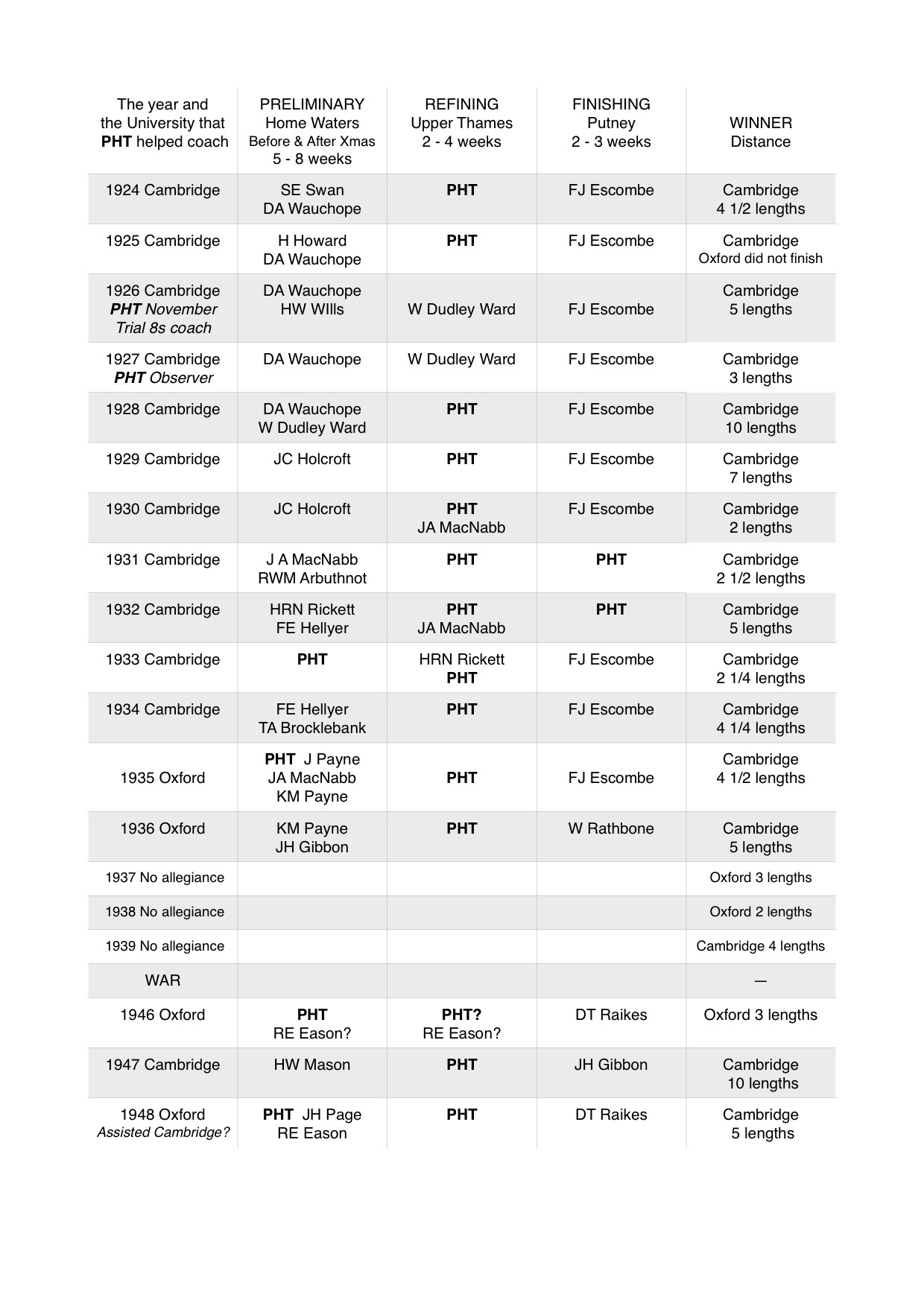In an attempt to put a huge amount of information into an easily digestible form, I have produced the table below showing Haig Thomas’s coaching involvement in the Boat Race, 1924 – 1948. These facts have been gathered from the detailed, informed and almost daily Times newspaper reports on pre-Boat Race training that was a characteristic of the inter-war era. After 1945, the coverage was less comprehensive and the coaching plan for 1946 in particular was not reported as clearly as before. The phrases ‘preliminary’ and ‘refining’ are my own; ‘finishing’ was and is in common use.