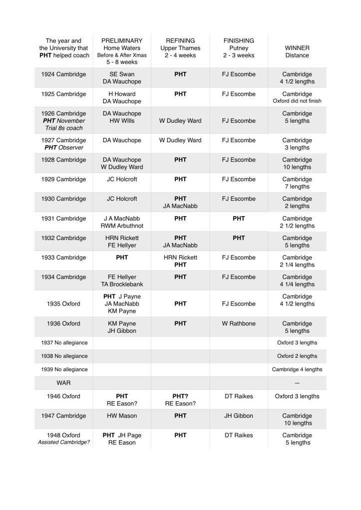 PHT seemingly had no significant part in the Boat Races of 1926, 1927, 1937, 1938 and 1939. He was due to coach Cambridge for the unofficial wartime Boat Race of 1940 but did not recover from an operation in time to do so.