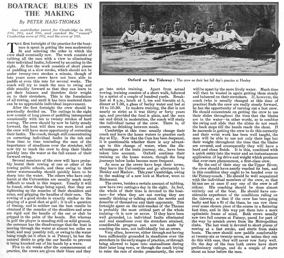 As the above shows, Haig Thomas had significant input into the training of ten Cambridge crews (1924 – 1925, 1928 – 1934, 1947), all of whom won. Five of ‘his’ Light Blue crews were especially regarded: 1924, 1928, 1929, 1932 and 1934. For reasons explained in Part Three, PHT also coached four Oxford Crews (1935, 1936, 1946, 1948), though only the 1946 crew was victorious.