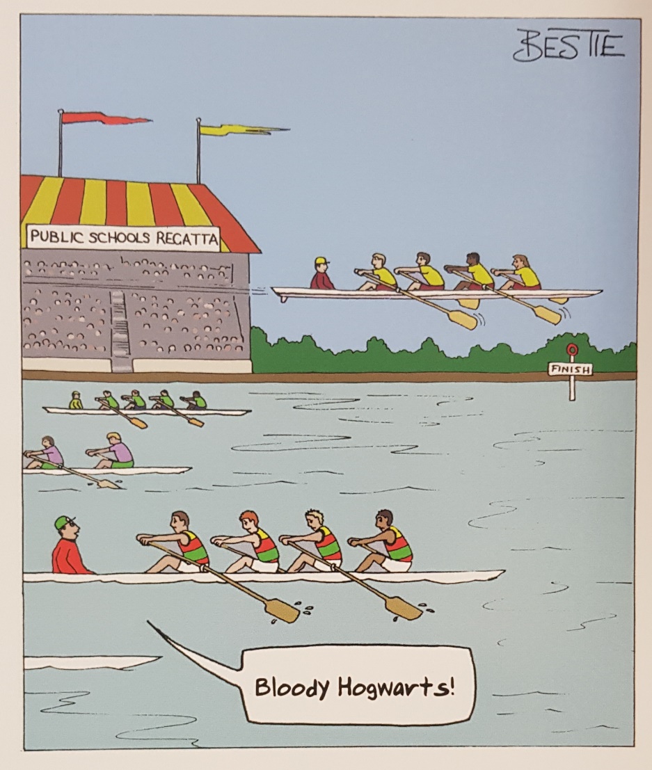 Hogwarts has four houses called after the four founders of the school. Their colours are: Gryffindor – Scarlet and Gold; Ravenclaw – Blue and Bronze; Slytherin – Green and Silver, and Hufflepuff – Yellow and Black. There are at least two houses represented in the above picture. I suppose we’ll never know if there was a Hogwarts School Boat Club or just competition for House Fours, Pulling and Sculling. But if there was, would they have had a ‘flying start’ or a ‘flying finish’?