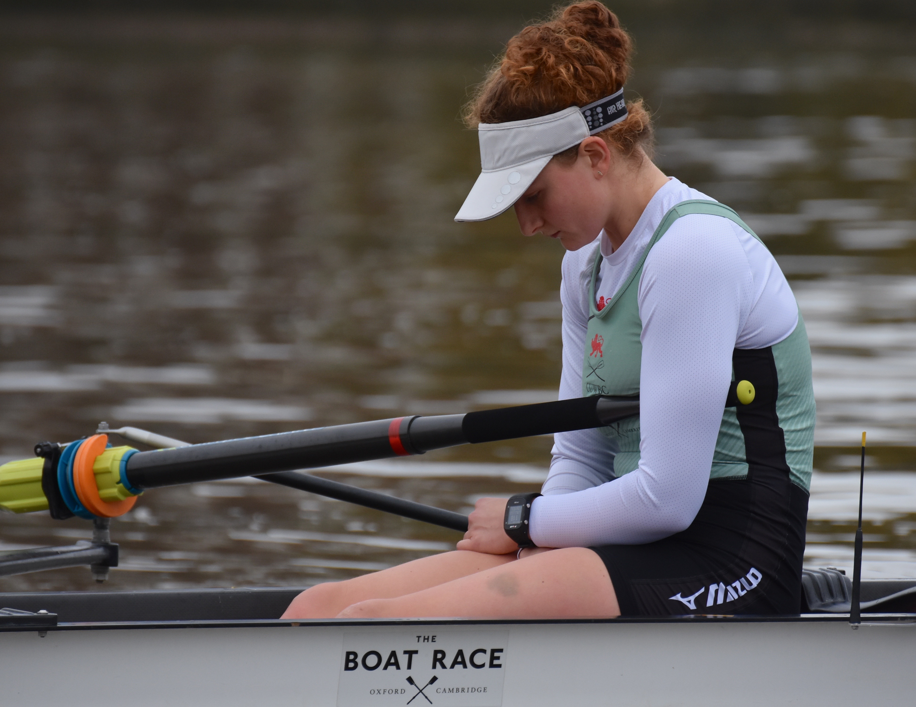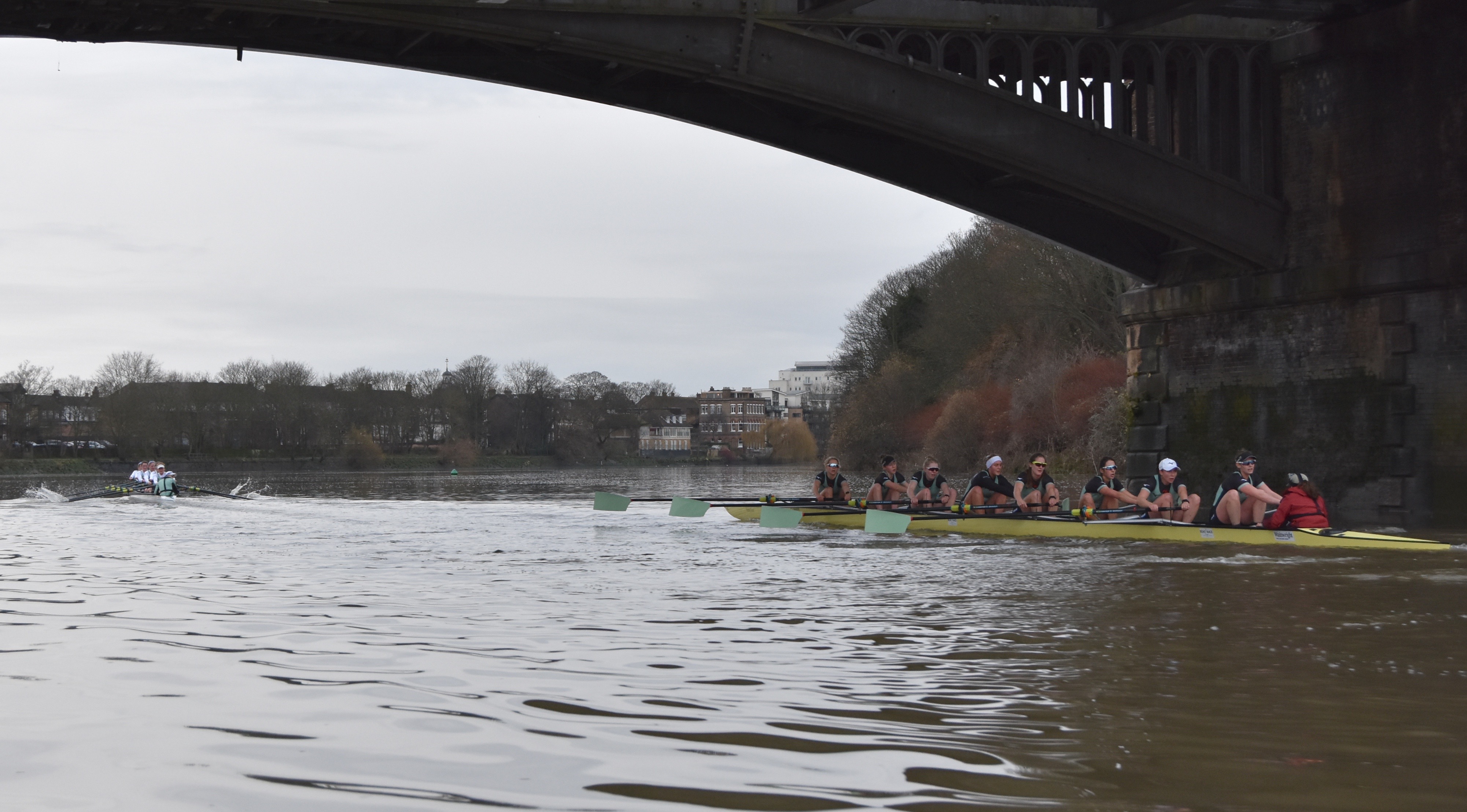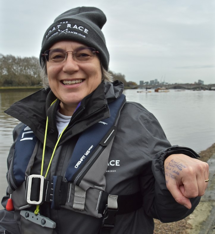 Women’s race umpire, Judith Packer, displays her crib notes.Caoimhe (‘Quee-va’) Dempsey, the stroke of Actin, perhaps in pre-race meditation.Tricia Smith, ‘7’ in Actin, also in a reflective mood.Actin was in white on Surrey while Myosin raced in black tops on Middlesex. Off the start, the crews kept well apart, though both coxes spent a long time steering too close to Middlesex. By the end of Putney Embankment, Actin was slightly ahead. Parallax error makes the boat nearest to the camera seem to be further up than it actually is.Actin take the lead.Along Fulham Reach, Actin extended its lead.At Hammersmith Bridge, Actin’s lead over Myosin was ‘comfortable’ even before it got the full benefit of the bend.Myosin passing Furnivall Green.At Chiswick Steps.Actin approaching Barnes Bridge.Myosin under Barnes Bridge, four lengths down on Actin.Towards Mortlake.Approaching the finish, Myosin put in a strong push and closed the gap, but Actin remained in control and crossed the finish line two lengths up. The crews are listed here.