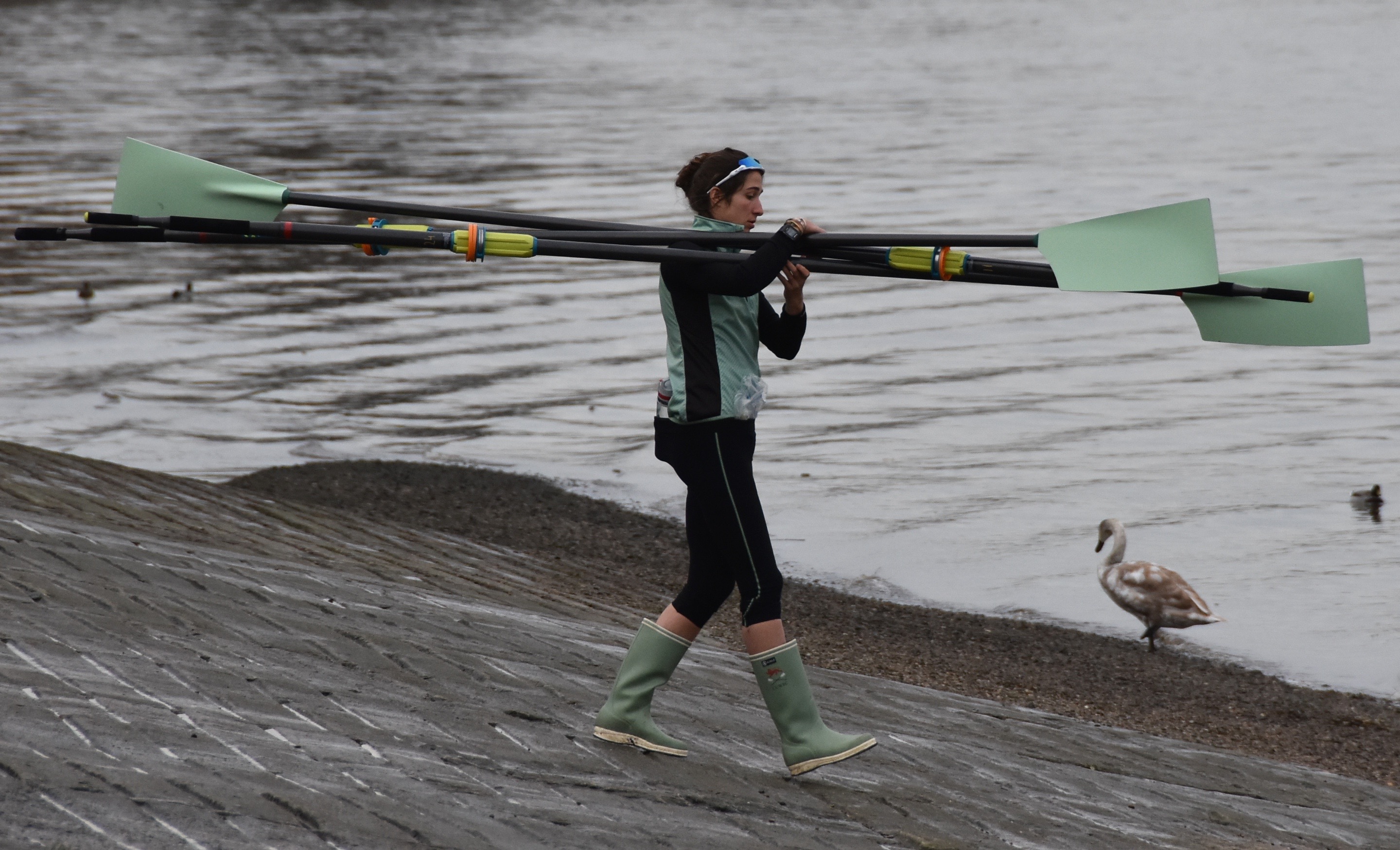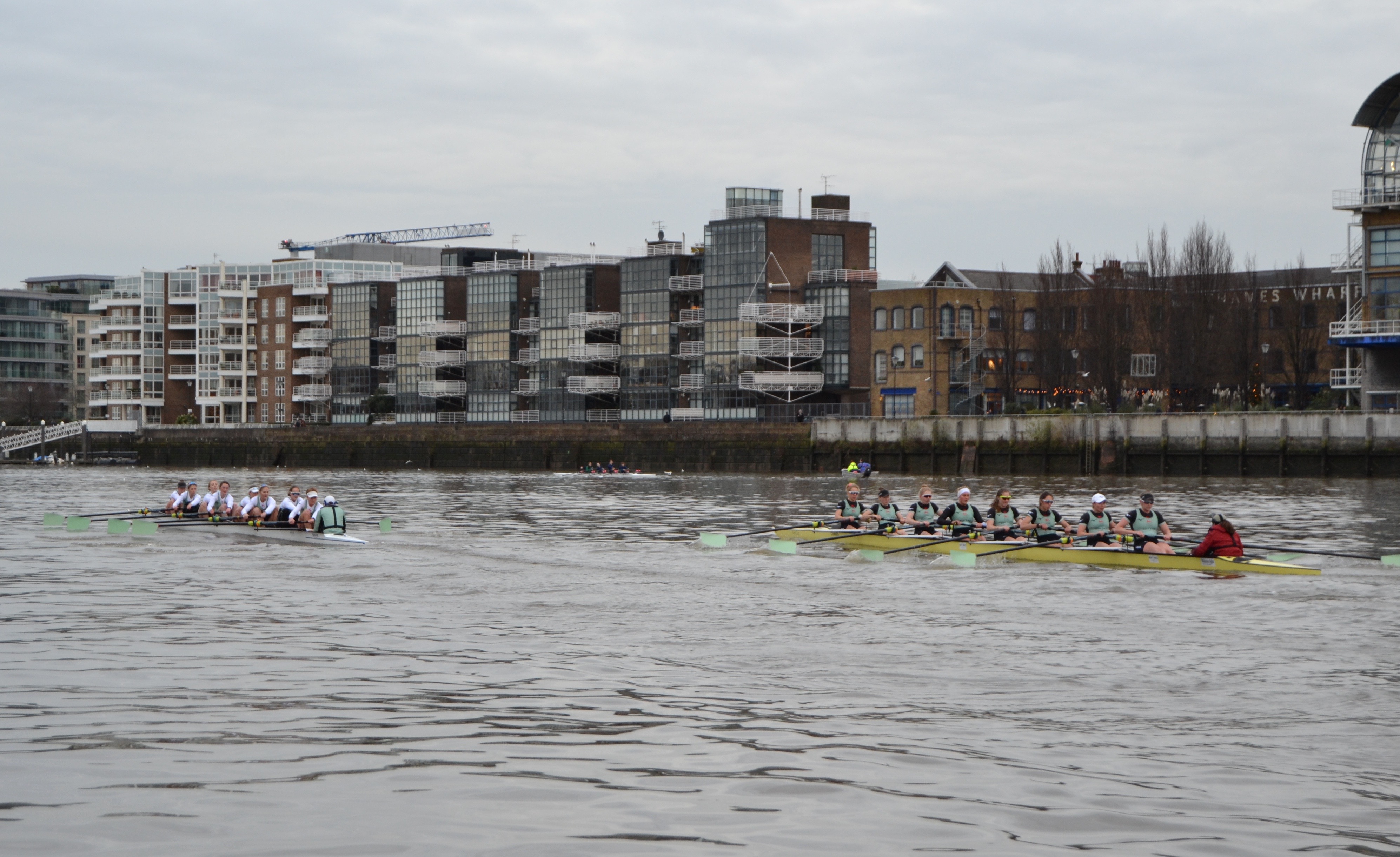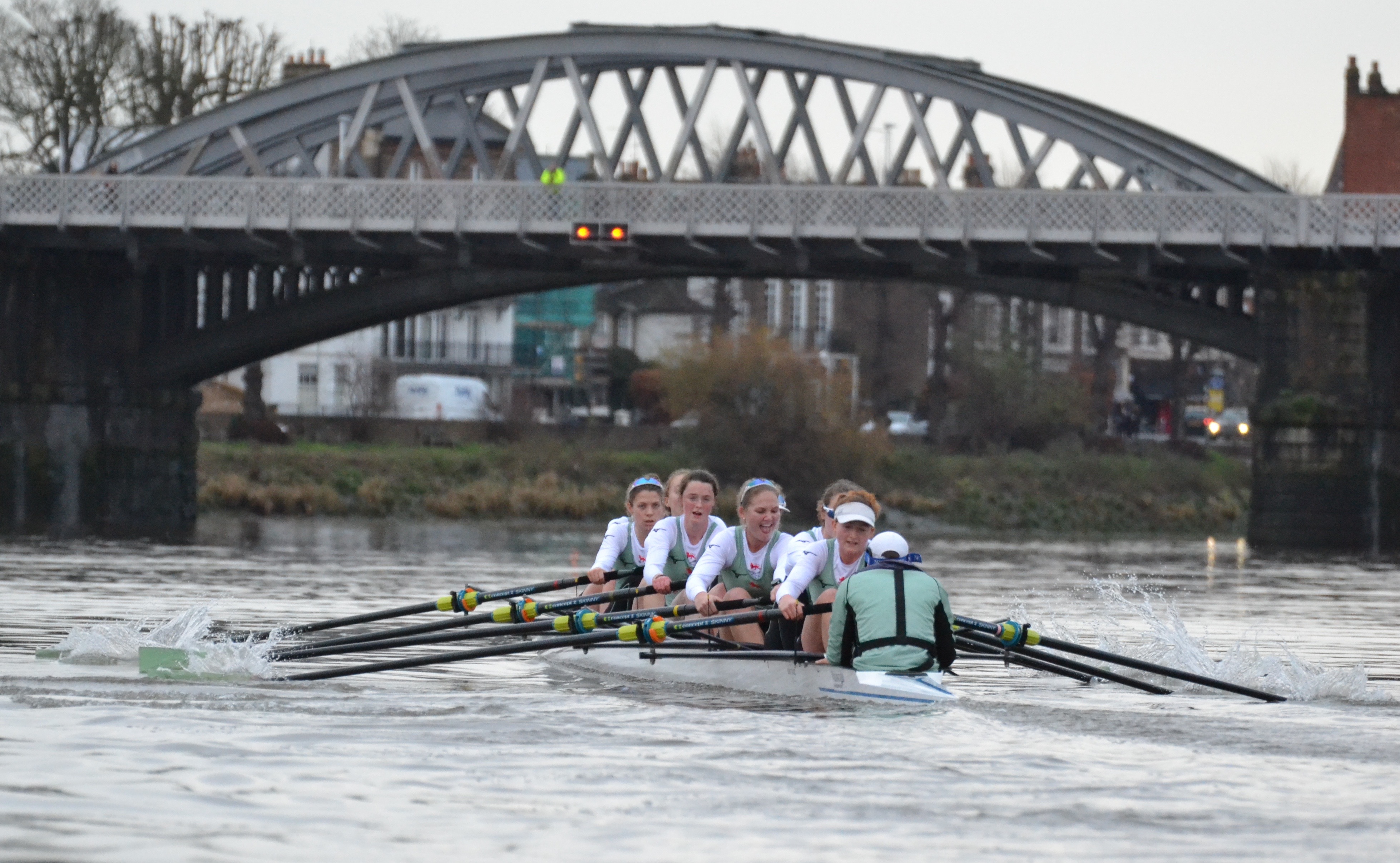 Women’s race umpire, Judith Packer, displays her crib notes.Caoimhe (‘Quee-va’) Dempsey, the stroke of Actin, perhaps in pre-race meditation.Tricia Smith, ‘7’ in Actin, also in a reflective mood.Actin was in white on Surrey while Myosin raced in black tops on Middlesex. Off the start, the crews kept well apart, though both coxes spent a long time steering too close to Middlesex. By the end of Putney Embankment, Actin was slightly ahead. Parallax error makes the boat nearest to the camera seem to be further up than it actually is.Actin take the lead.Along Fulham Reach, Actin extended its lead.At Hammersmith Bridge, Actin’s lead over Myosin was ‘comfortable’ even before it got the full benefit of the bend.Myosin passing Furnivall Green.At Chiswick Steps.Actin approaching Barnes Bridge.Myosin under Barnes Bridge, four lengths down on Actin.Towards Mortlake.Approaching the finish, Myosin put in a strong push and closed the gap, but Actin remained in control and crossed the finish line two lengths up. The crews are listed here.