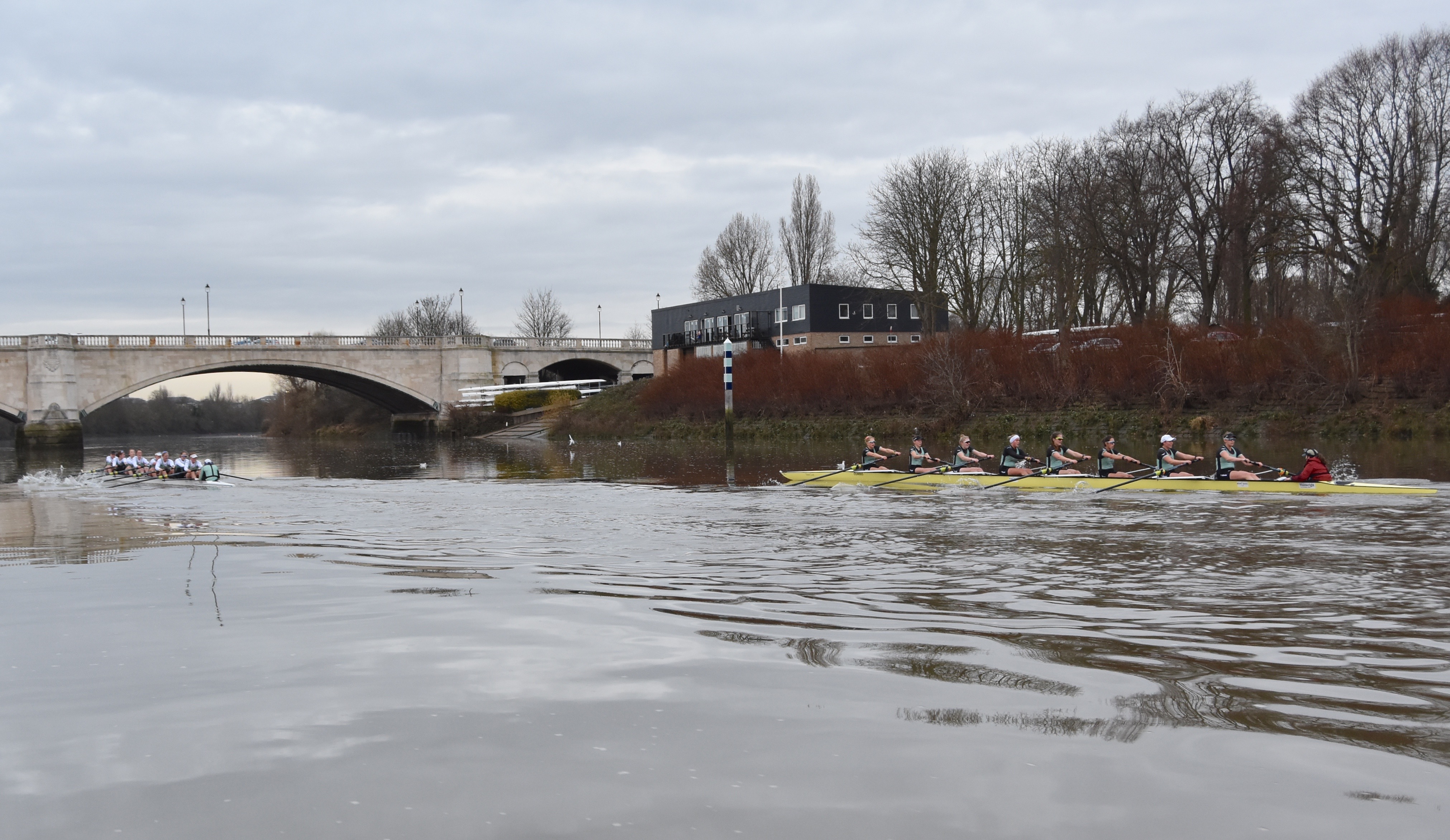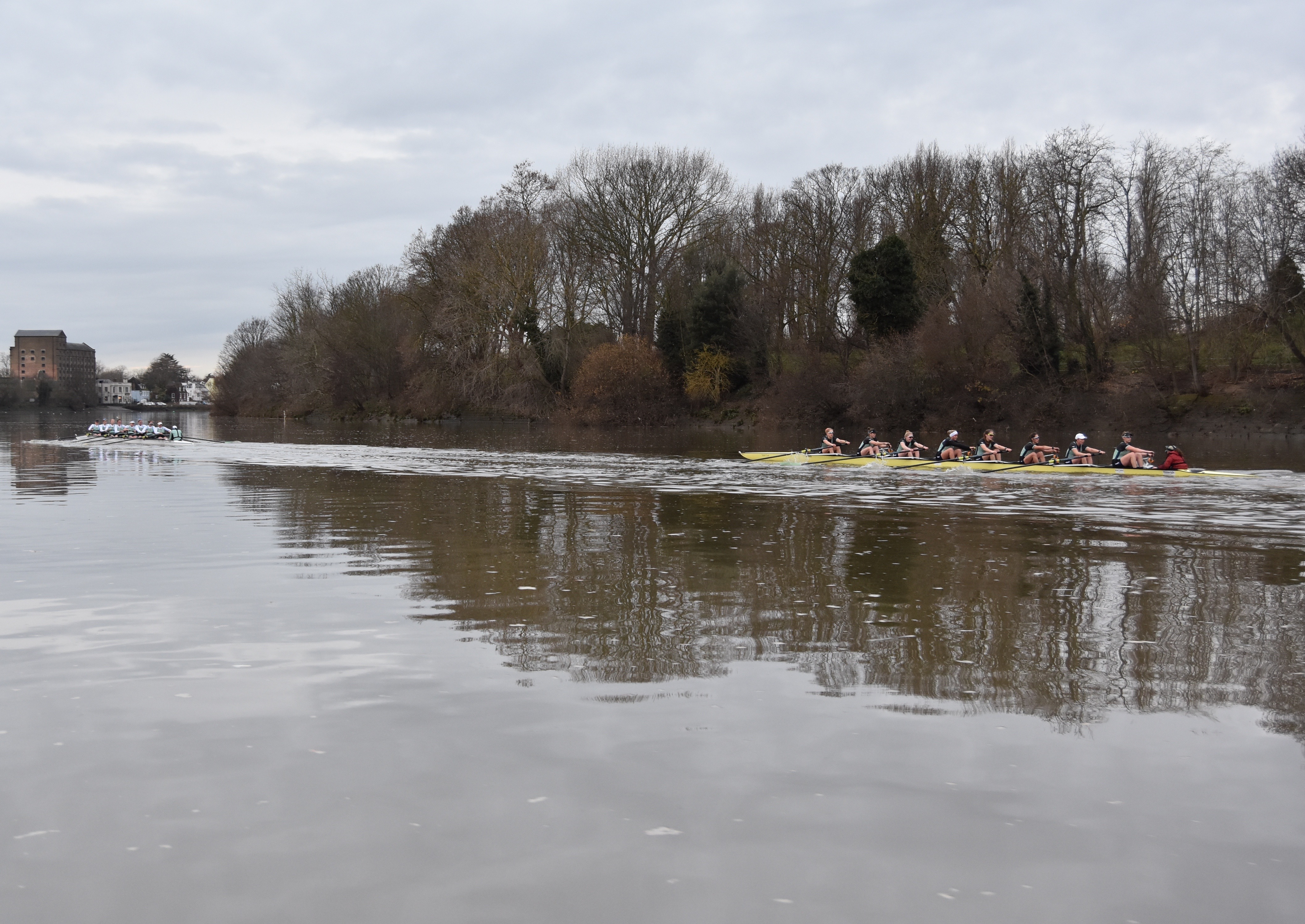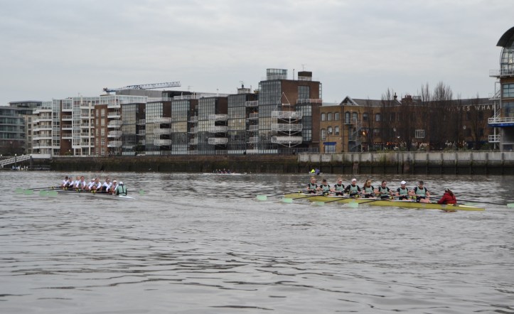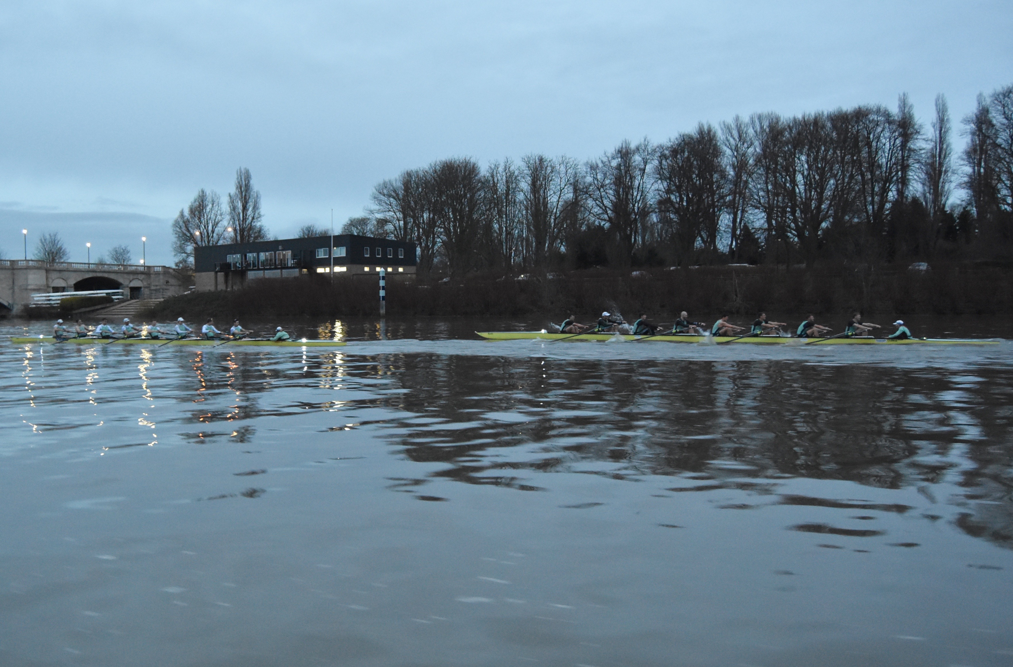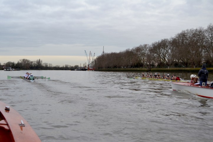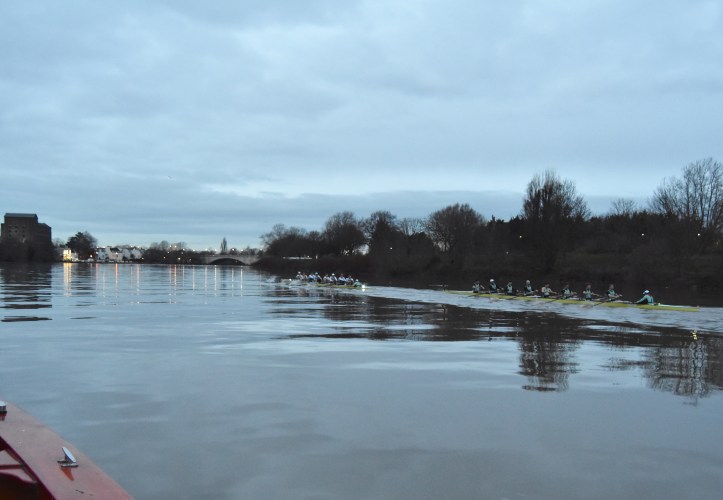 Unusually, the Cambridge men’s squad is running three eights into the New Year. Before the eights went off, the remaining members of the squad went into two coxed fours that raced each other over the course.