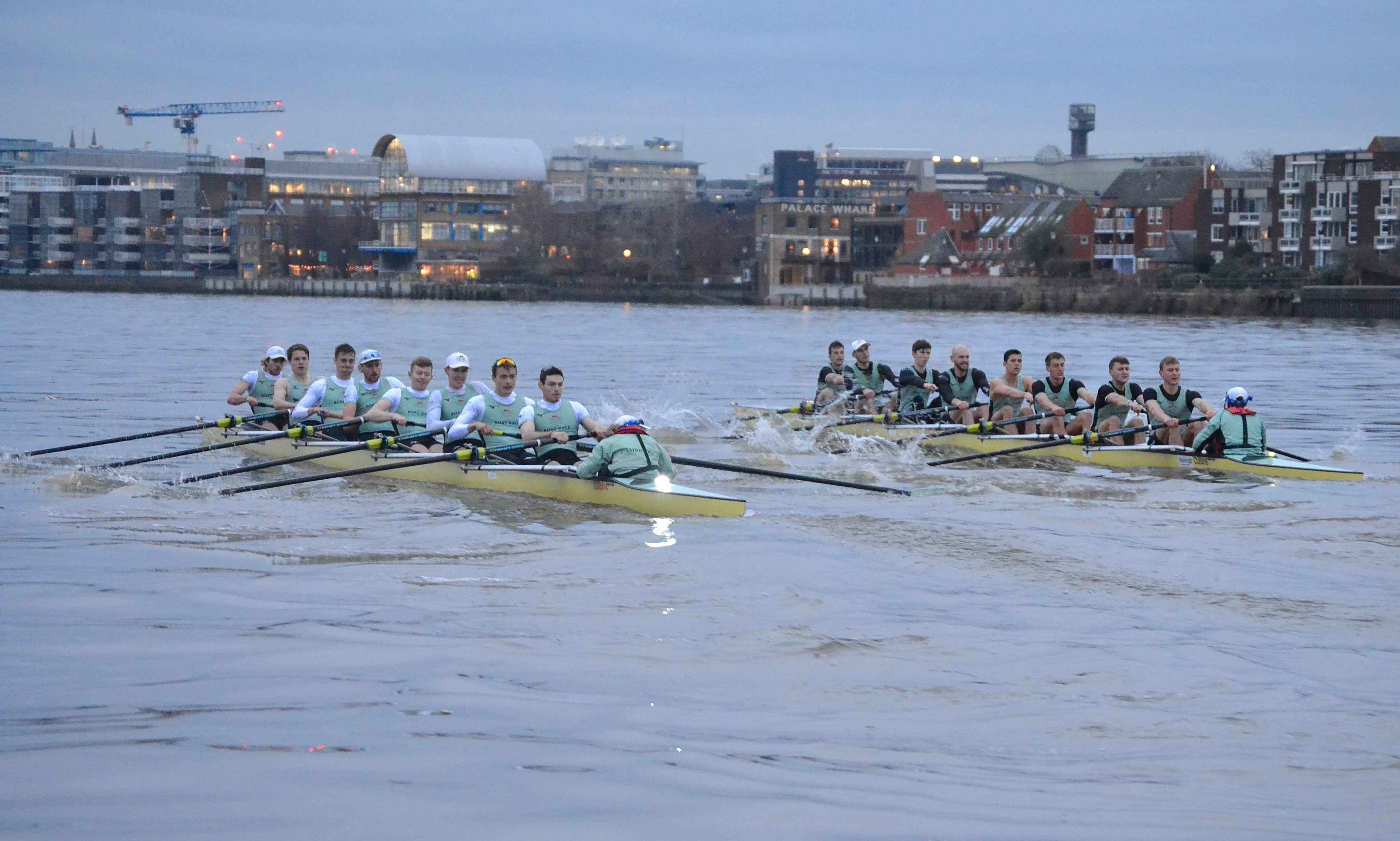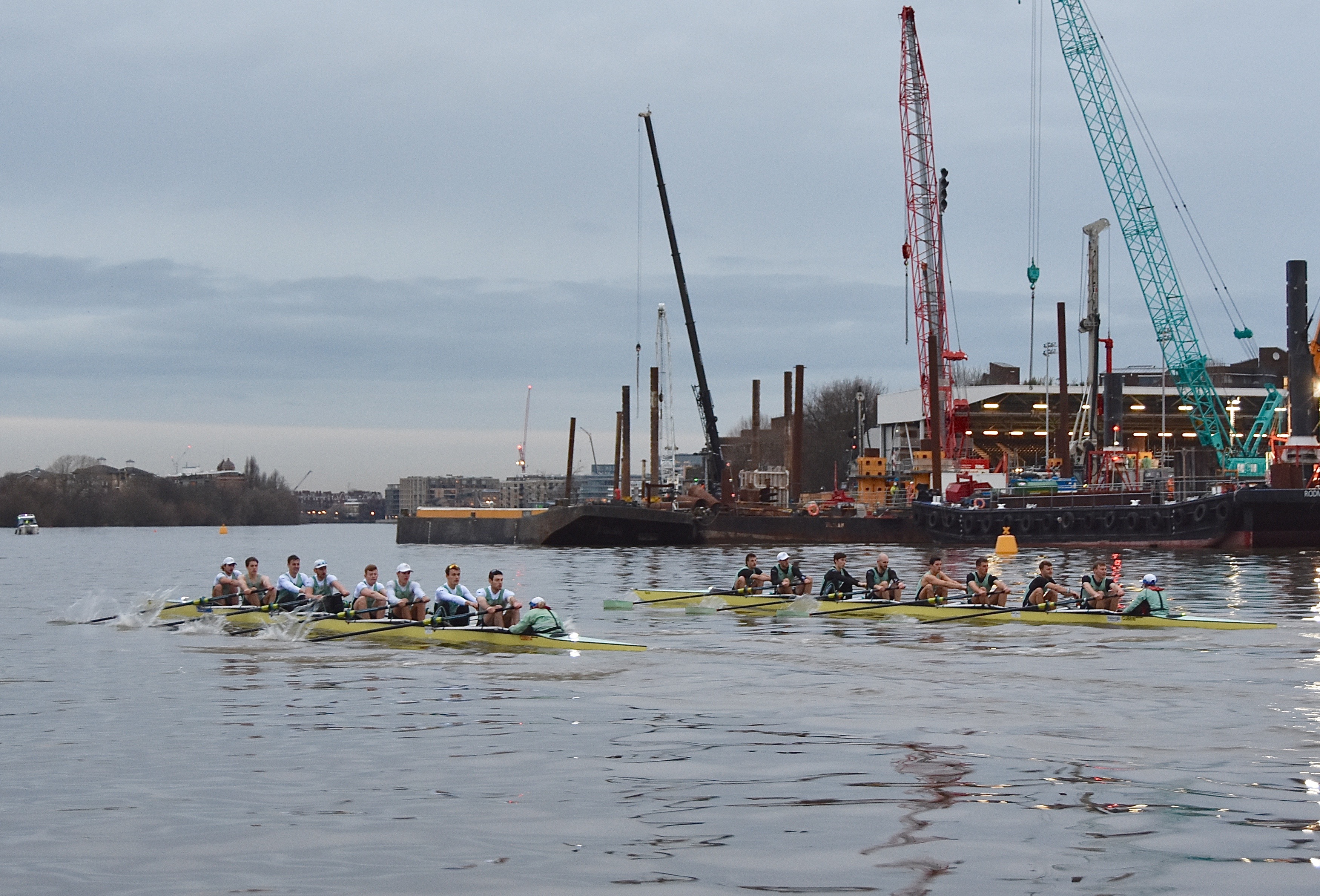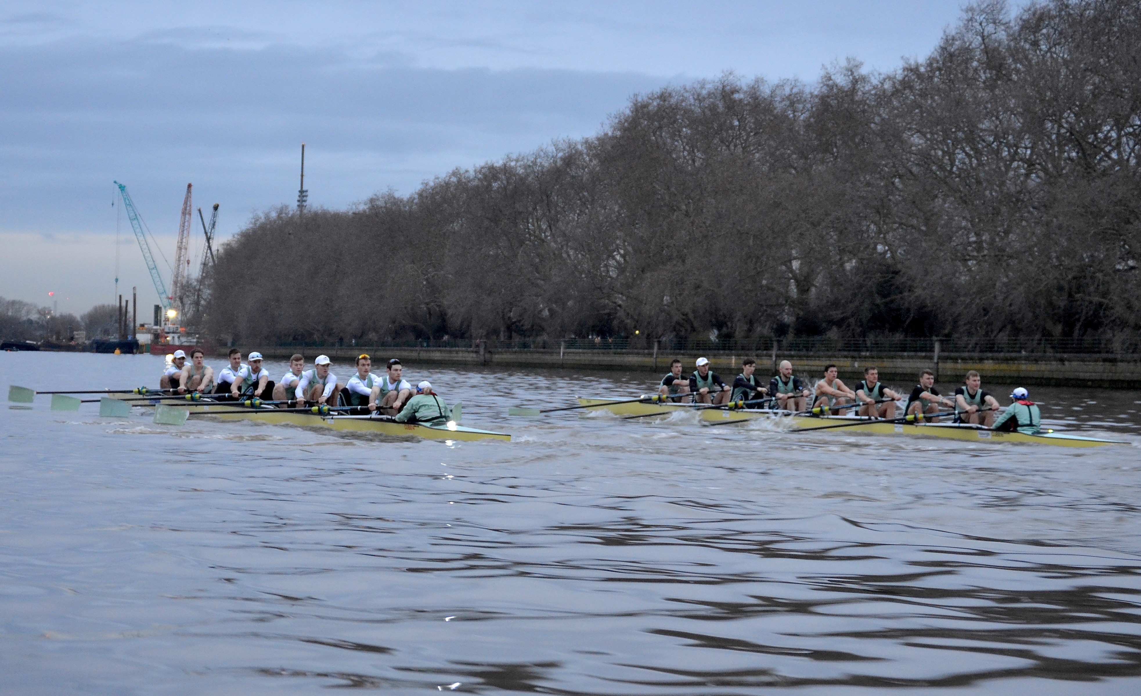 Unusually, the Cambridge men’s squad is running three eights into the New Year. Before the eights went off, the remaining members of the squad went into two coxed fours that raced each other over the course.
