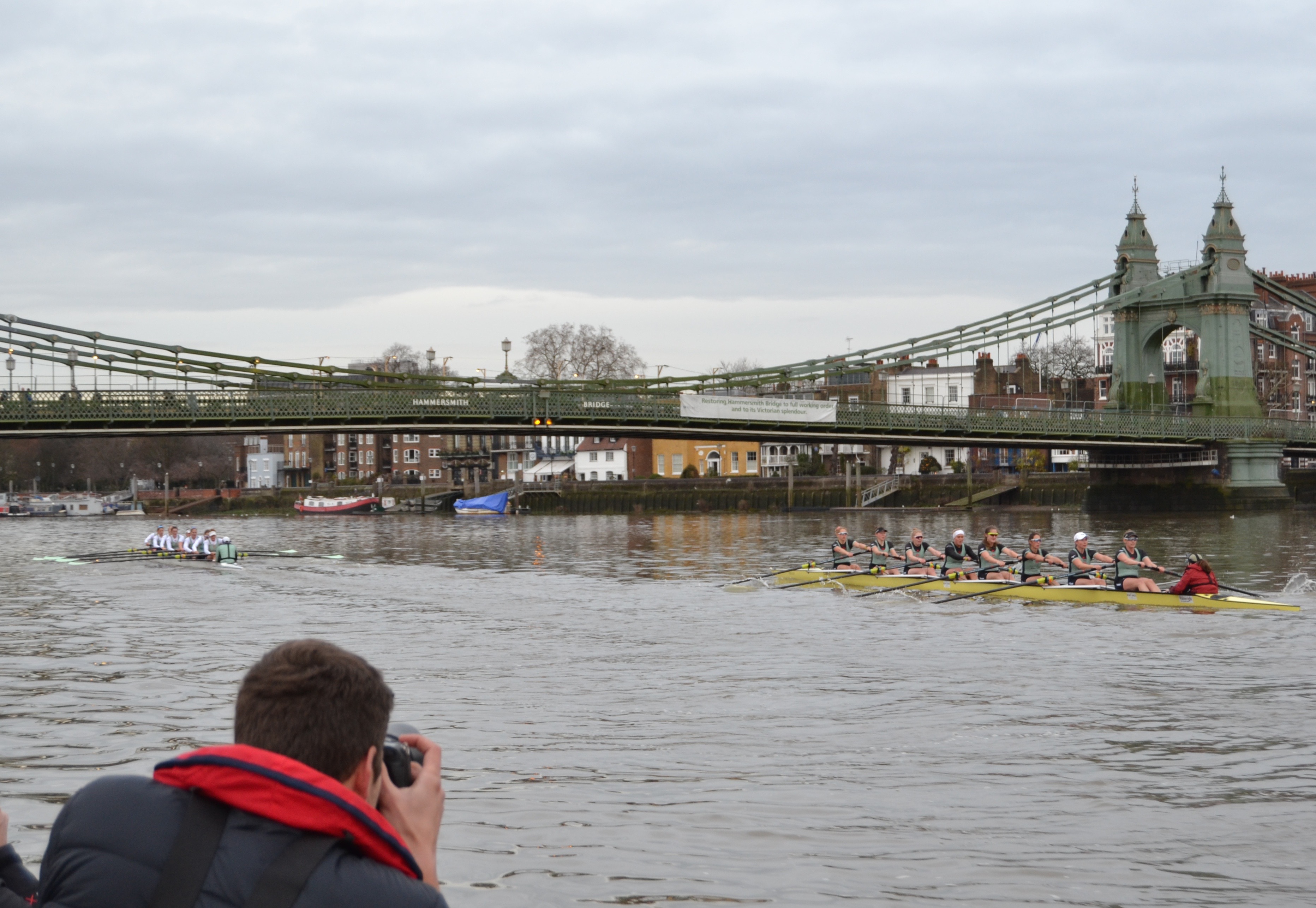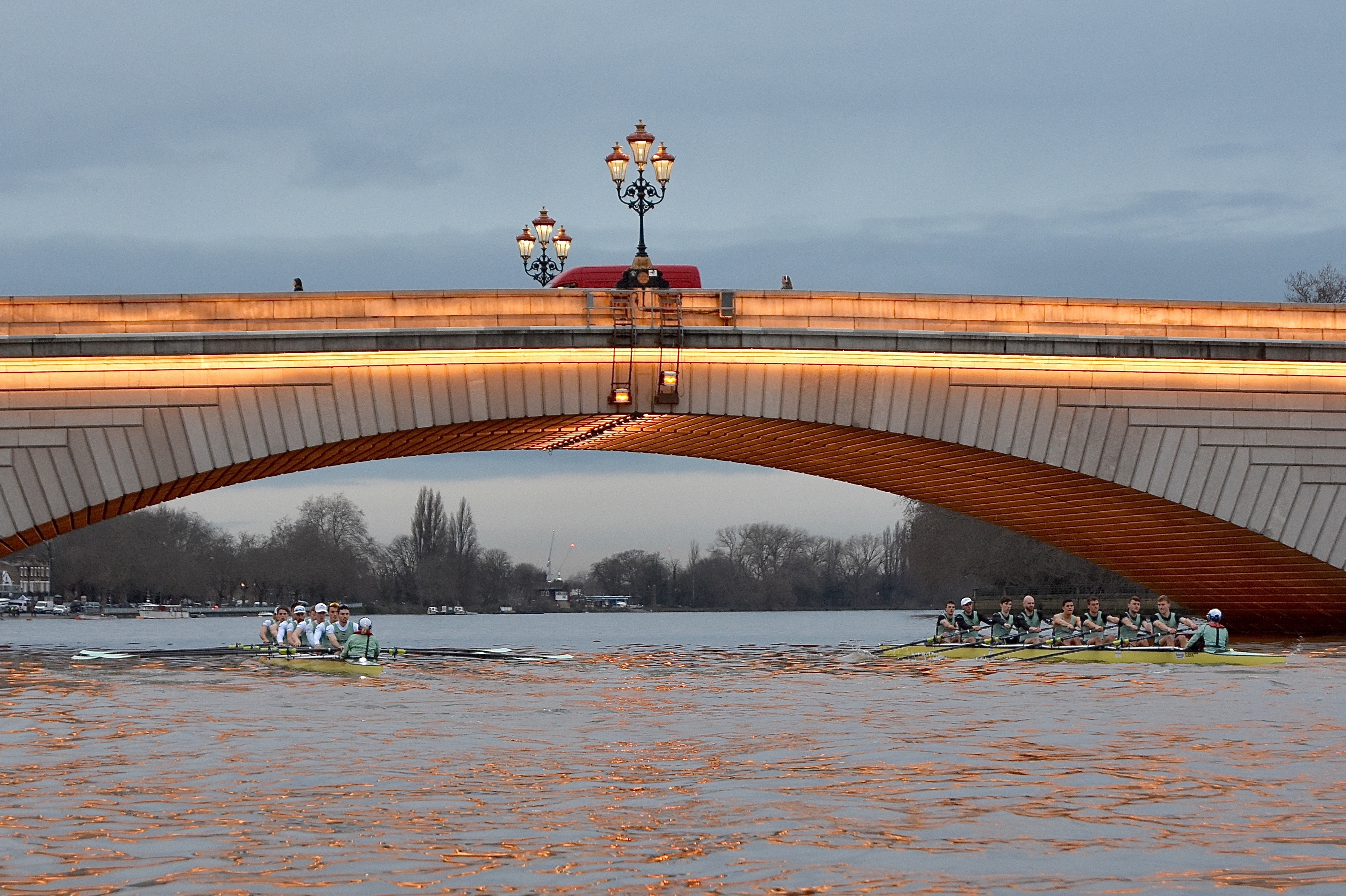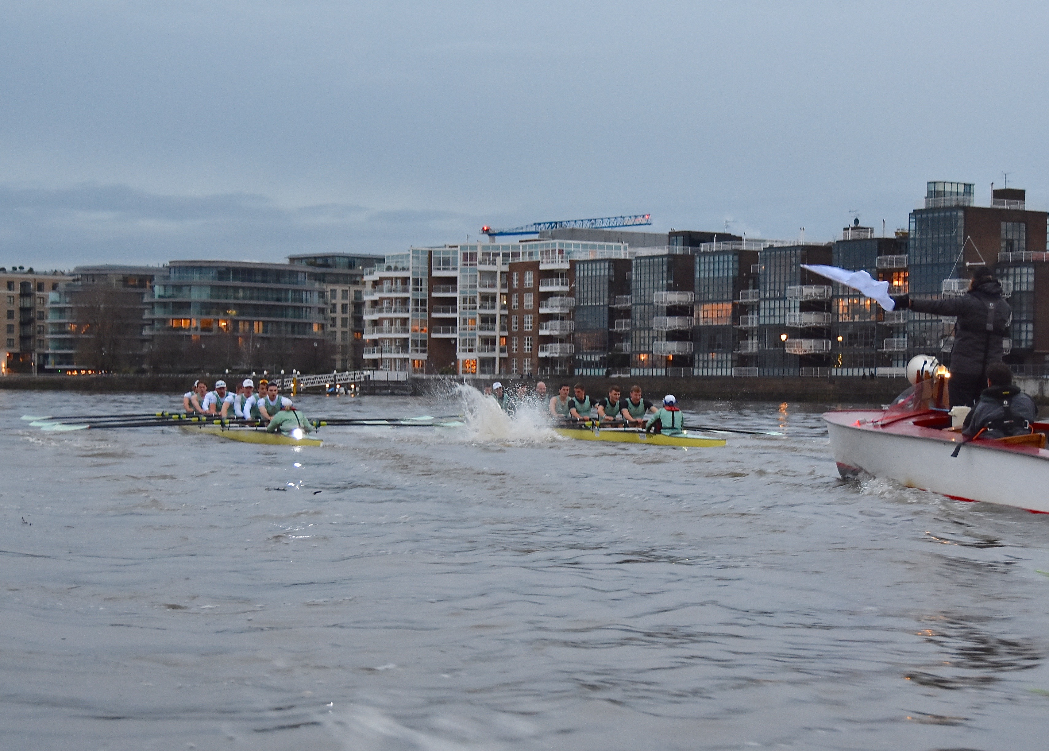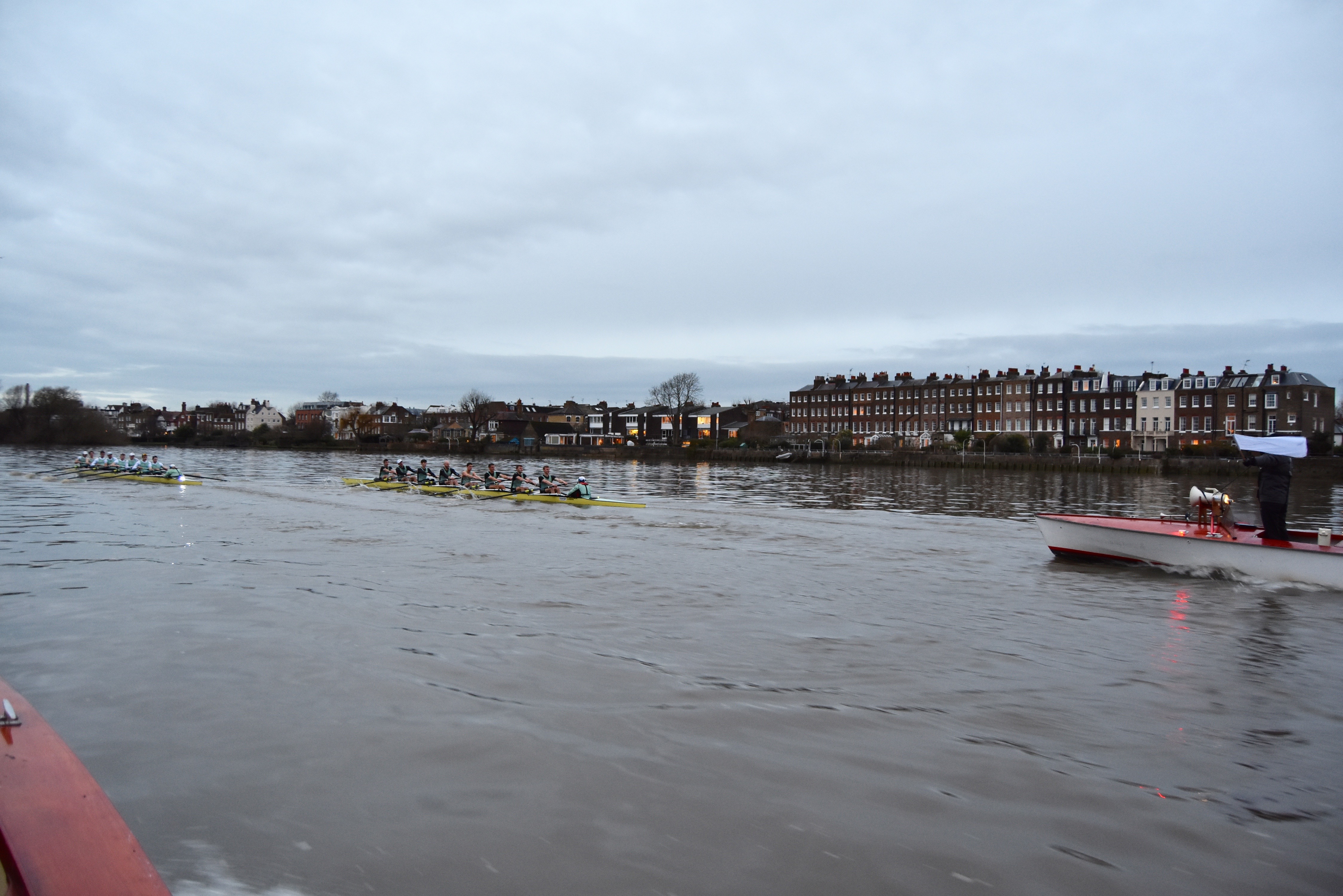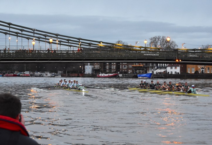 The men’s race want off at 15.45, five minutes before the official time of sunset. Taking photographs of fast moving objects that are far away and in low light from an unstable platform is not without its problems, as the quality of the following pictures shows.Boogaloo, in white tops, was on Surrey, Electric, in black tops, was on Middlesex. The crews were level to the end of the Embankment.Boogaloo and Electric providing exciting one-on-one racing.For a time after the Mile Post, Electric went 1/4 length before the crews drew level again. Umpire Winckless was kept very busy warning both crews and blades briefly touched several times.Perhaps Boogaloo came out of this clash the best.By Hammersmith, Boogaloo had taken the lead.At St Paul’s School, Boogaloo led by 3/4 length.Passing Chiswick Eyot. Boogaloo had taken advantage of the long bend and opened up a lead of 1 length.Approaching Barnes Bridge, Electric tried to take advantage of their bend and make up some distance.Both crews wind up for the finish line.Boogaloo cross the finish line about a length up. The crew lists are here.