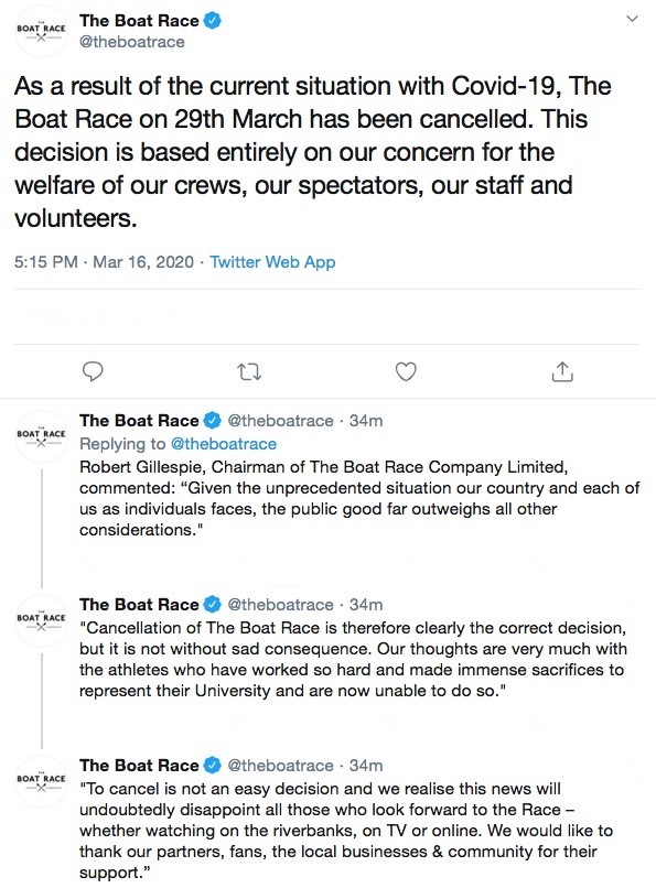It is no doubt crass to write about the effect that the worldwide virus is having on rowing; the situation is rather more serious than the fact that some long, thin boats with outmoded propulsion systems are prevented from proving they are a bit faster than another such craft. However, it is difficult for anyone who regularly logs onto Hear The Boat Sing – and also the wider ‘rowing family’ – not to be effected by the fact that at 17.15 GMT today, 16 March, the Boat Race Company tweeted that it was cancelling the 2020 Oxford – Cambridge Boat Races due to be held on 29 March. Earlier in the day, the Prime Minister, in the first of a series of daily briefings, said that everyone should avoid gatherings and crowded places.