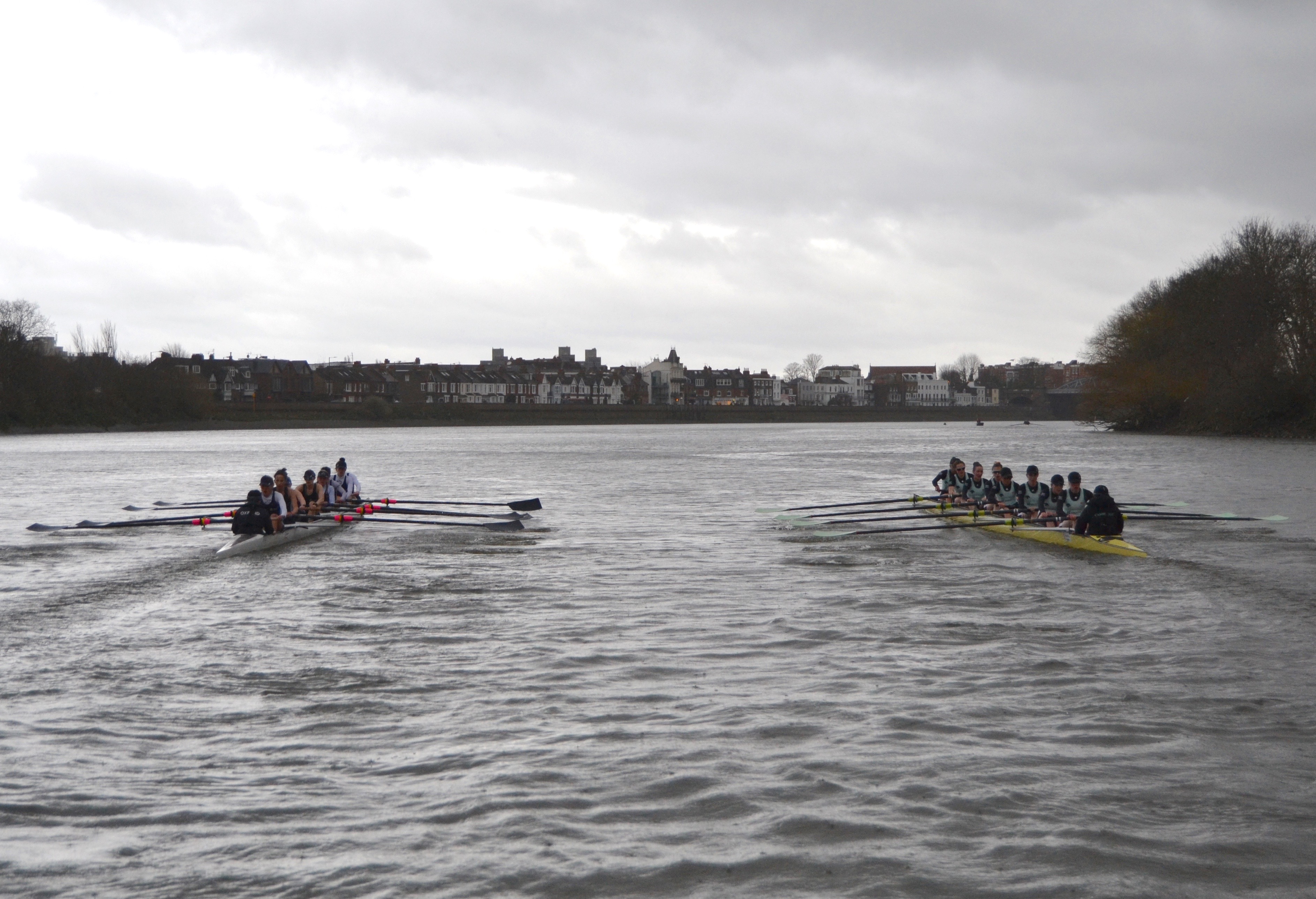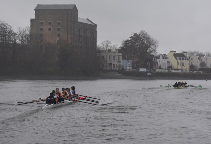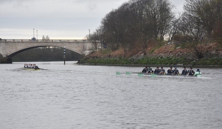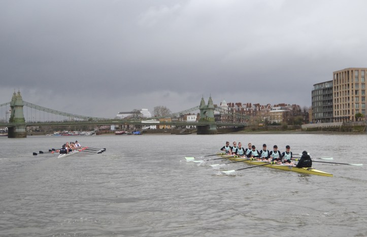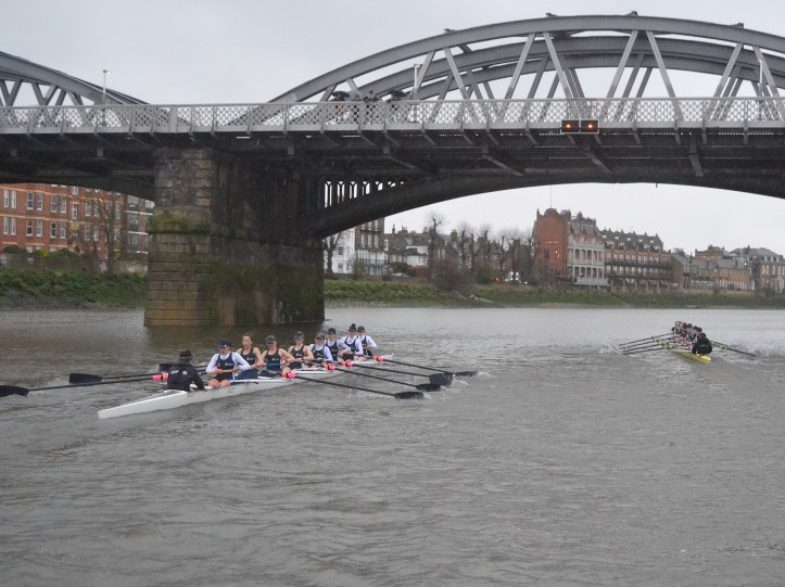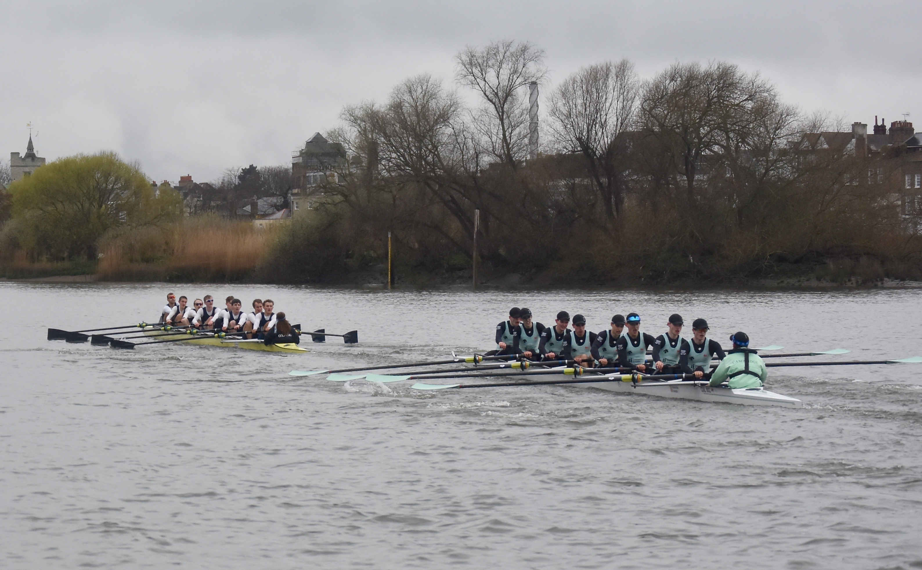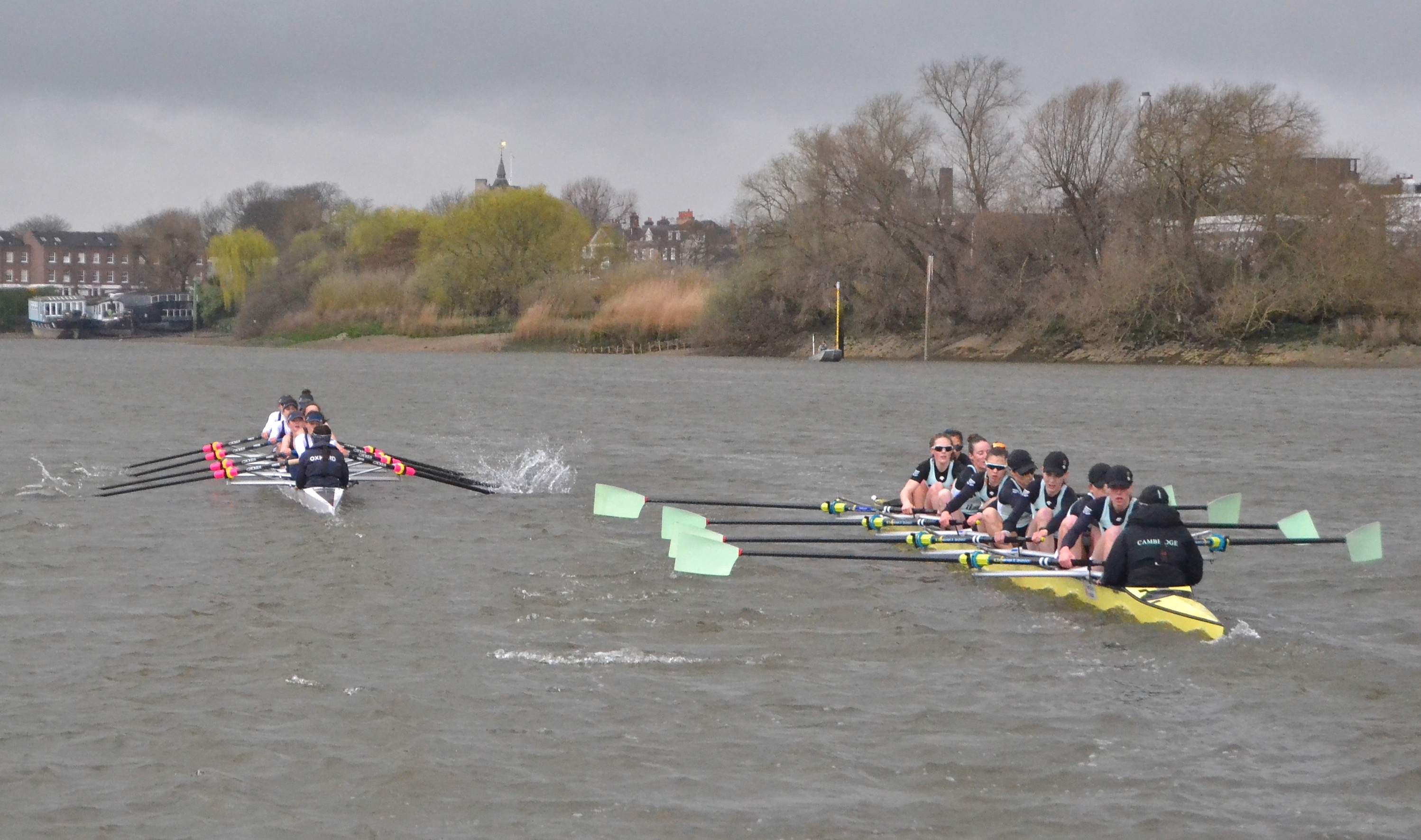 Through Hammersmith Bridge and passing St Paul’s School, there may have been a little clear water between the two. By now, many crews in Cambridge’s position (a length down after several failed pushes and having come out of a couple of clashes worse off) would have given up and limped to the finish in the wake of their opponents. However, approaching the ‘blue window’ half-way point, the Tabs took the rate up and regained overlap. At this point, Old Father Thames decided to see what the crews were really made of and threw a head wind and rough water at them.