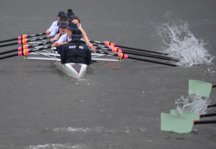 Spectators were left confounded as the two crews went around the Fulham bend. This naturally favours the crew on the Middlesex station, but Oxford’s coxswain, Chloe Tubman, seemed somewhat too enthusiastic in taking the corner, and for some time the two crews were widely separated across the river. While they may not have had the optimal line, Oxford enjoyed a sharp and aggressive stroke which powered them along at 37, and at Craven Cottage were almost a length ahead.