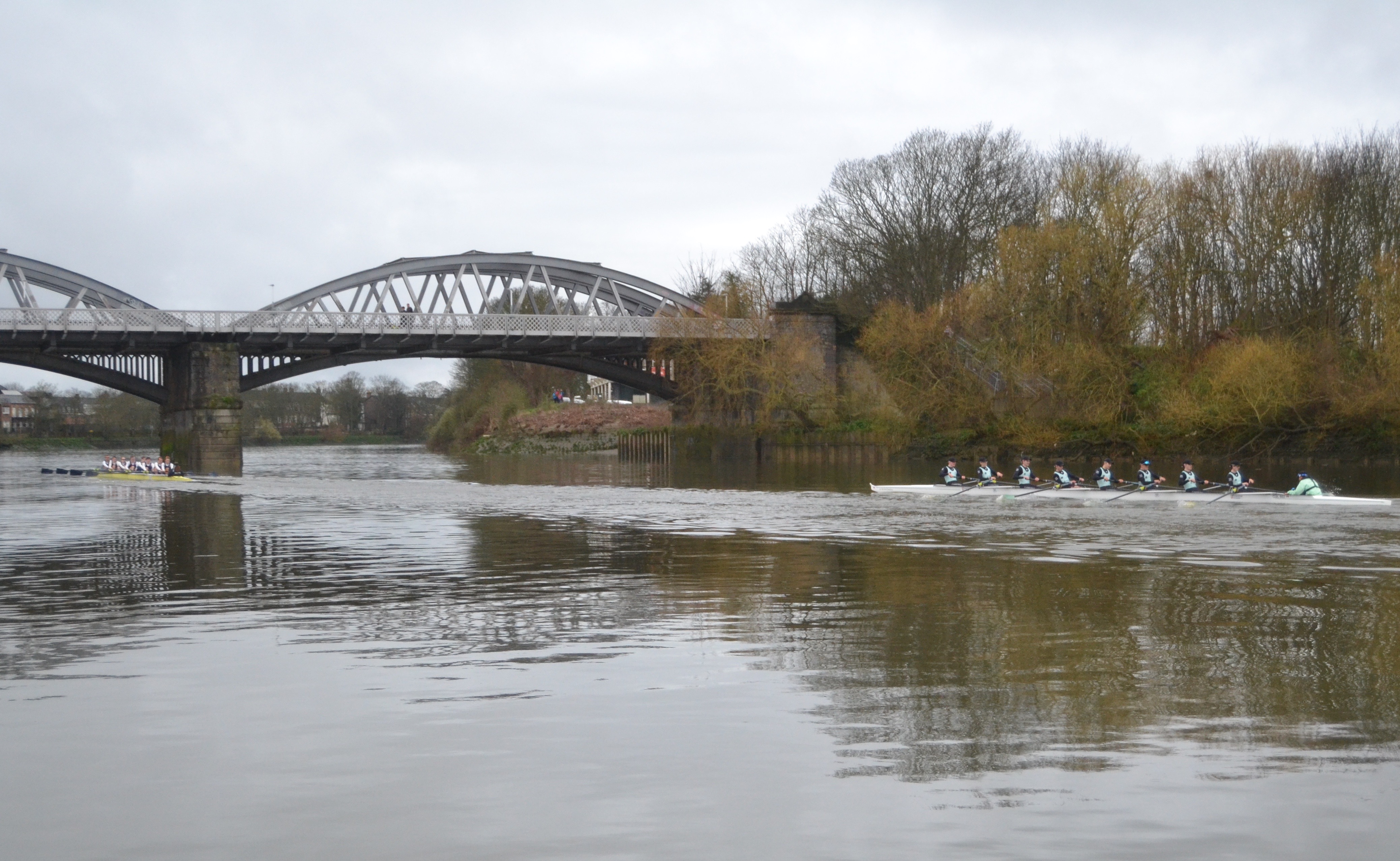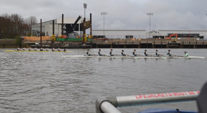 Approaching the point before Hammersmith Bridge where the bend would change to Oxford’s favour, Cambridge were only just maintaining overlap. The bridge time was about 8 minutes 20 seconds.