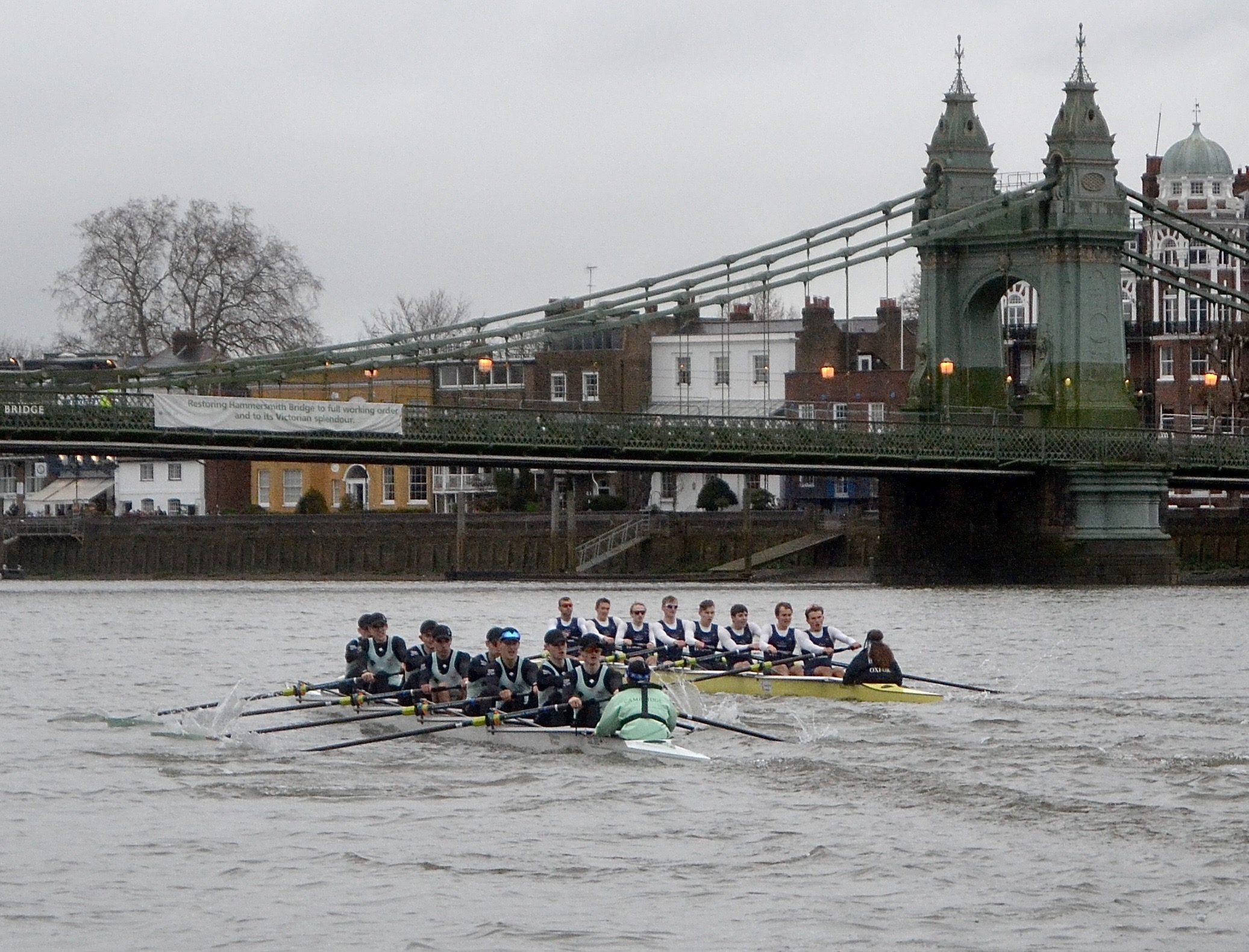 The course at this point favoured Cambridge as the crews began the approach to the long Surrey bend. Oxford, however, threw another push at their opponents, with powerful finishes propelling them to first a length lead, and then clear water, within the space of fifteen or so strokes. Cambridge seemed taken by surprise, and trailed Oxford as the crews shot Hammersmith Bridge, but the tightening bend allowed them to stay in contact.