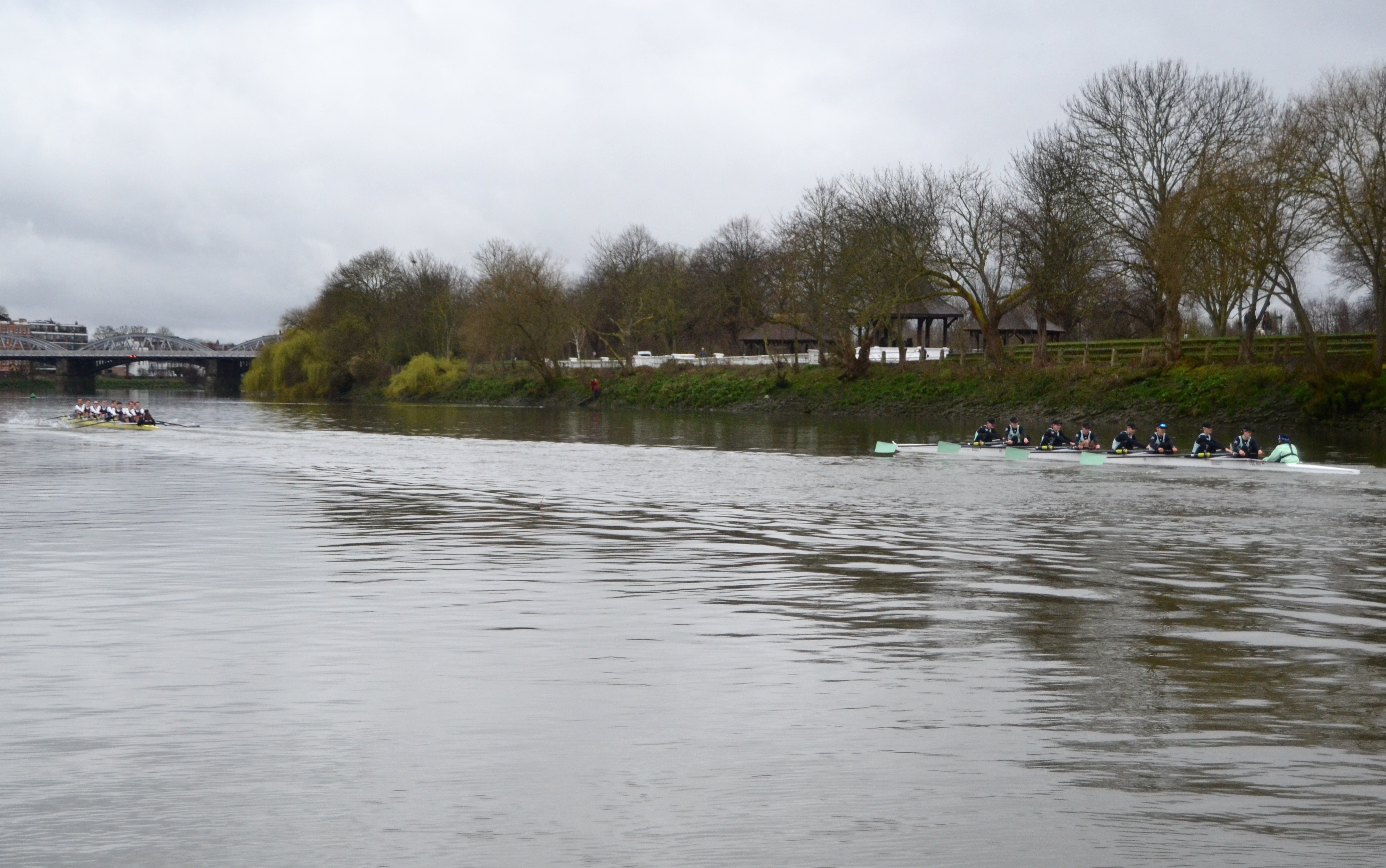 Cambridge’s line benefitted them better as the crews began the draw to Harrod’s Repository (now converted to flats), with Oxford having to move back towards their opponents to get into the fast part of the river. First Cambridge, and then Oxford executed pushes to try to gain an advantage as the crews passed the well-known landmark, but it was still Oxford ahead by approximately three-quarters of a length.