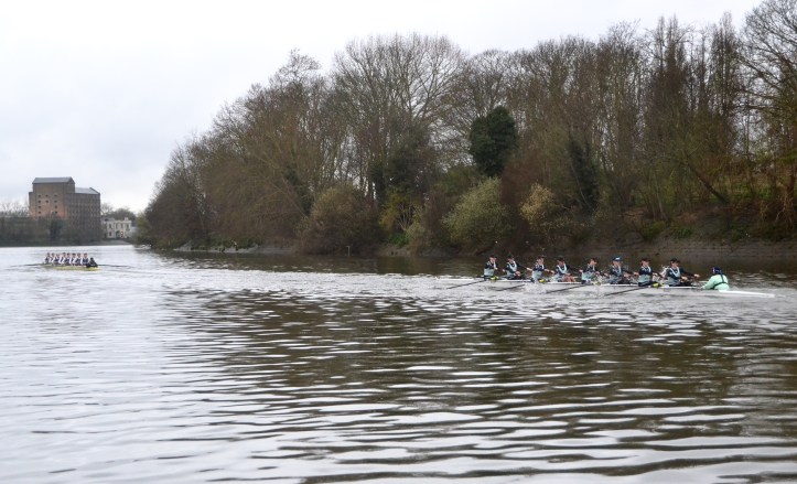 By Chiswick Pier (15 minutes and 2/3 way in), the boats were level and Cambridge took the lead going into Corney Reach, slowly moving away from a demoralised Oxford and reaching Barnes Bridge in about 19 minutes.
