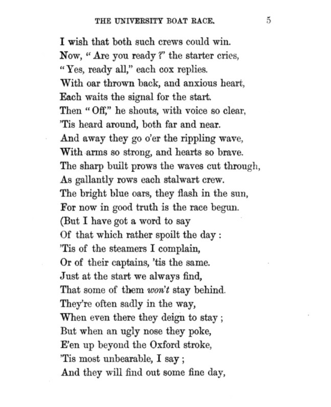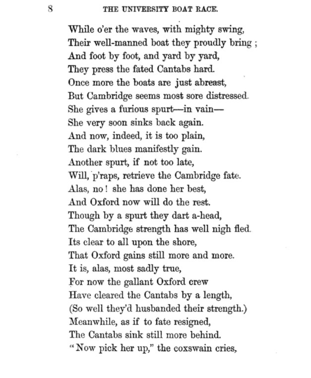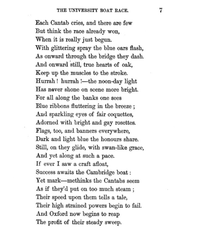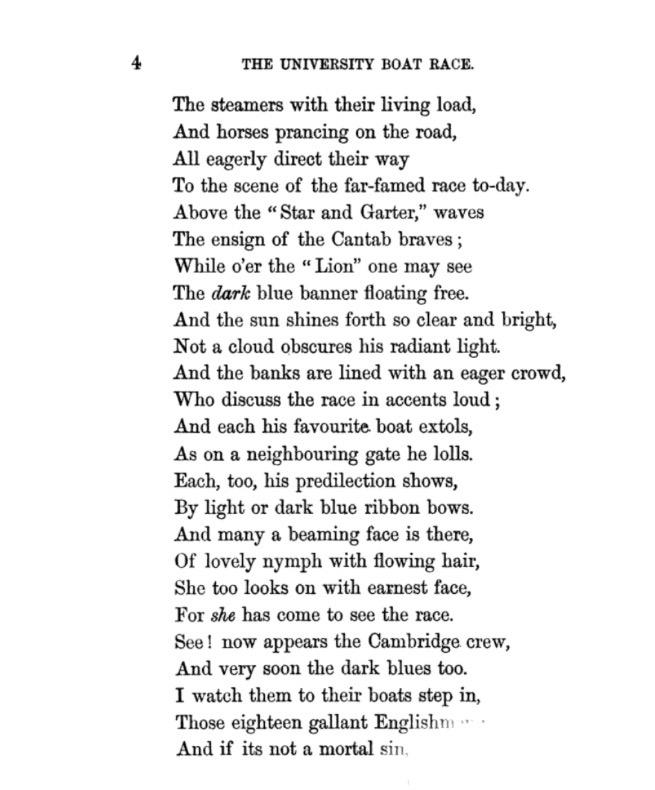 As Hargrave’s work may be hard to take in one lump, I shall reproduce it as it was originally published and intersperse it with some pictures. I cannot find any images of the losing Cambridge crew but there are at least three pictures of the Oxford Eight. Beneath each page, I have selected my favourite worst lines from it.