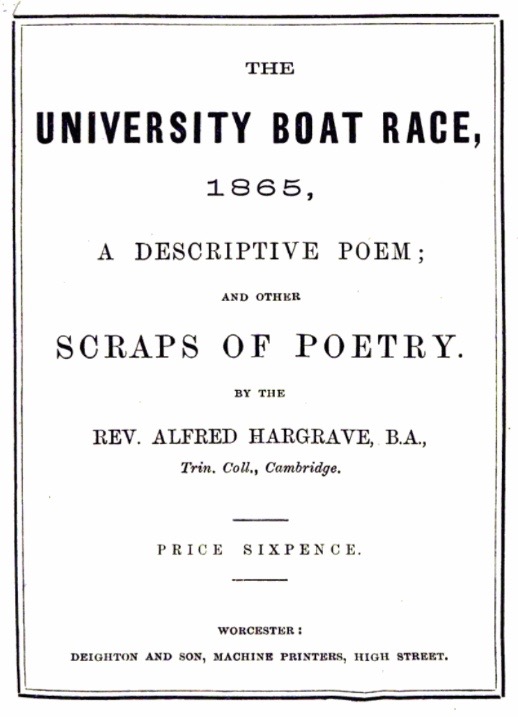 Before we expose ourselves to Hargrave’s narrative poem on the 1865 Boat Race, we should get the facts of that 22nd contest in prose. Drinkwater and Sanders’ The University Boat Race: Official Centenary History (1929) is probably the best source.