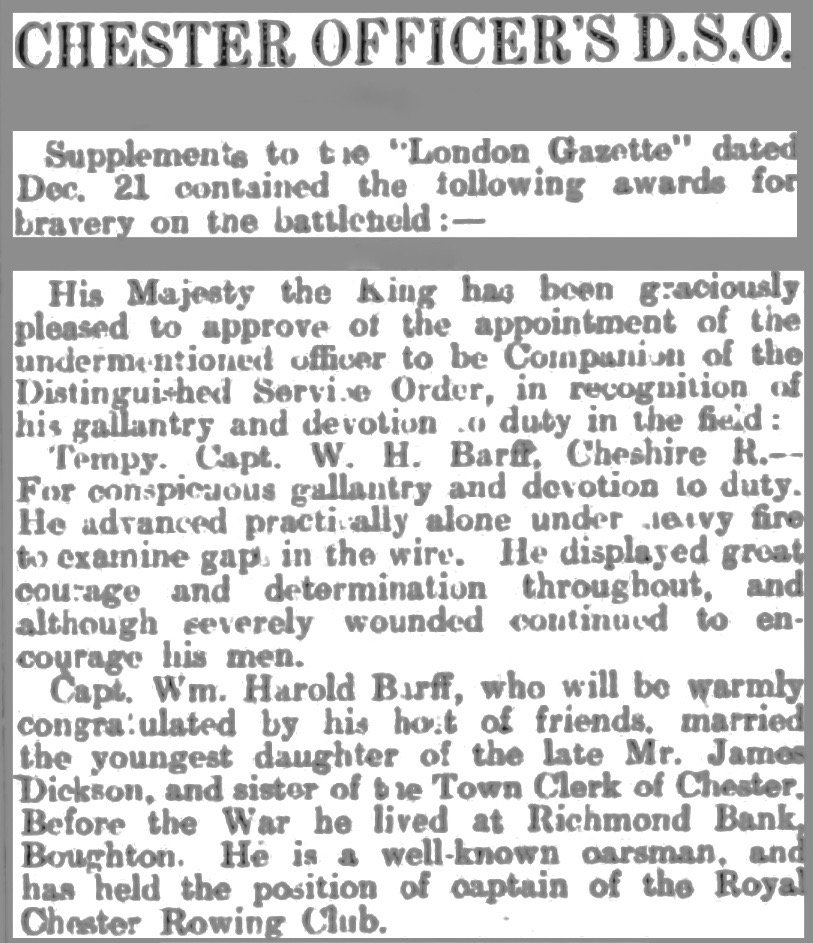 On the outbreak of war in 1914, a local newspaper wrote that 31 members of the Royal Chester Rowing Club had joined up and said that Barff was in the ‘Sportsmen’s Battalion’ of the Cheshire Regiment (though there seems to be no other record of his 12th Battalion being such a unit, perhaps it was an unofficial designation). In 1916, Barff won the Distinguished Service Order for leading a trench raiding party on Bulgarian positions during the Salonica Campaign in the Balkans, an action in which he was ‘severely wounded’.