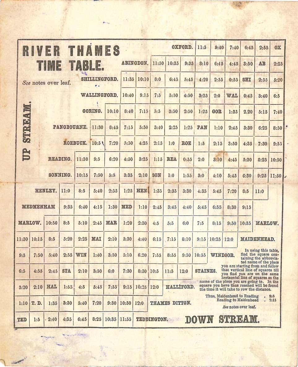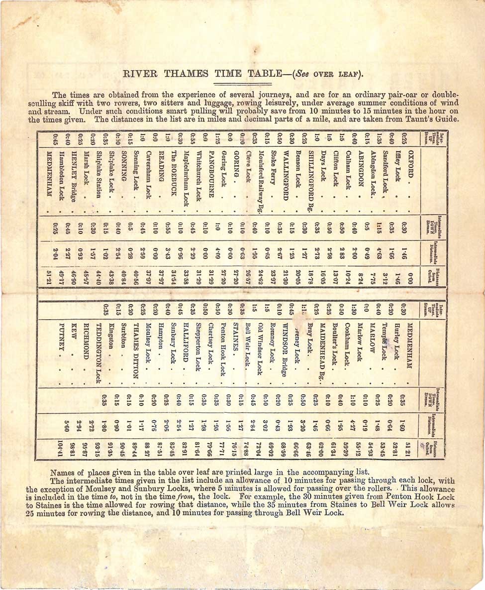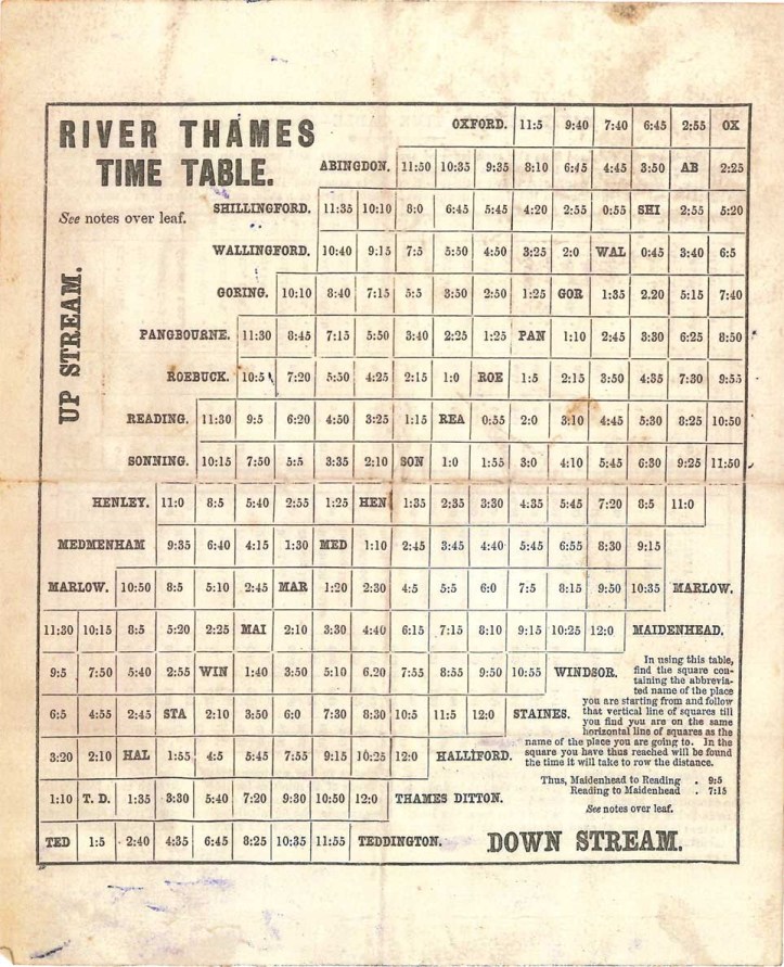 Another eBay acquisition arrived this week, this time an 1898 Thames timetable. Prepared 50 years before Betjeman’s poem, it provides another angle on which to glimpse the summer season on the river. The charming way it is produced as a guide to how long it takes to row between towns and locks from Oxford to Putney, with all the caveats about the size of the boats, number of people rowing or sculling, the weather and so on, make one want to get out on the water and see how it compares today. Would that we can very soon.
