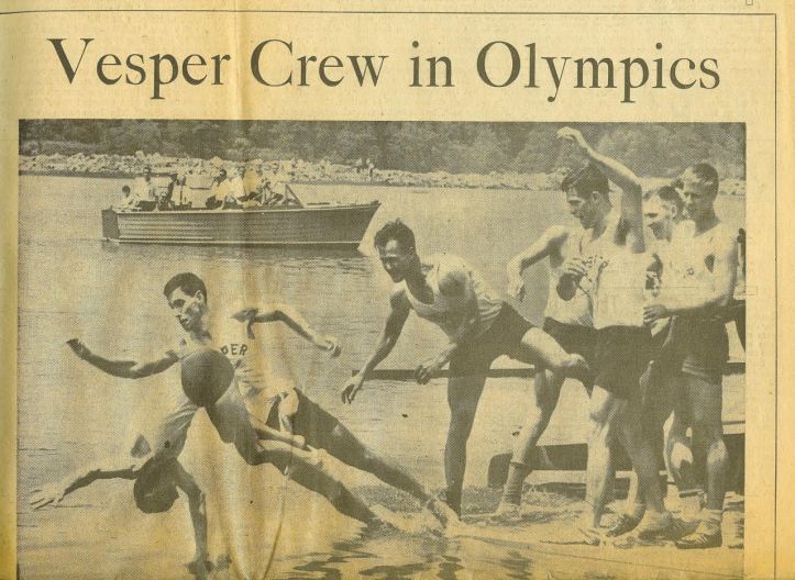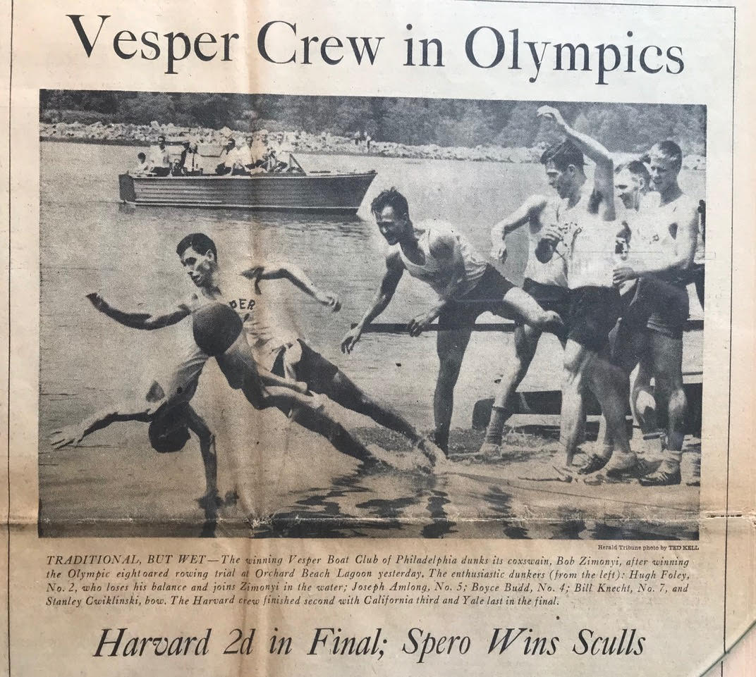 Rowing historian Bill Lanouette, who enjoys HTBS and, these days, especially Tom Weil’s TOPOR series, remembers a cox-toss that he witnessed in 1964 at the Olympic Rowing Trials at Orchard Beach Lagoon, N.Y., which he was covering for Herald Tribune Radio Network. Vesper BC was rowing against Harvard to see which crew was going to represent USA in the eights at the Tokyo Olympics. Vesper won the race and in the photograph above, in one of the newspapers which also covered the race, both the coxswain Róbert Zimonyi and one of the Vesper oarsmen are hitting the drink.