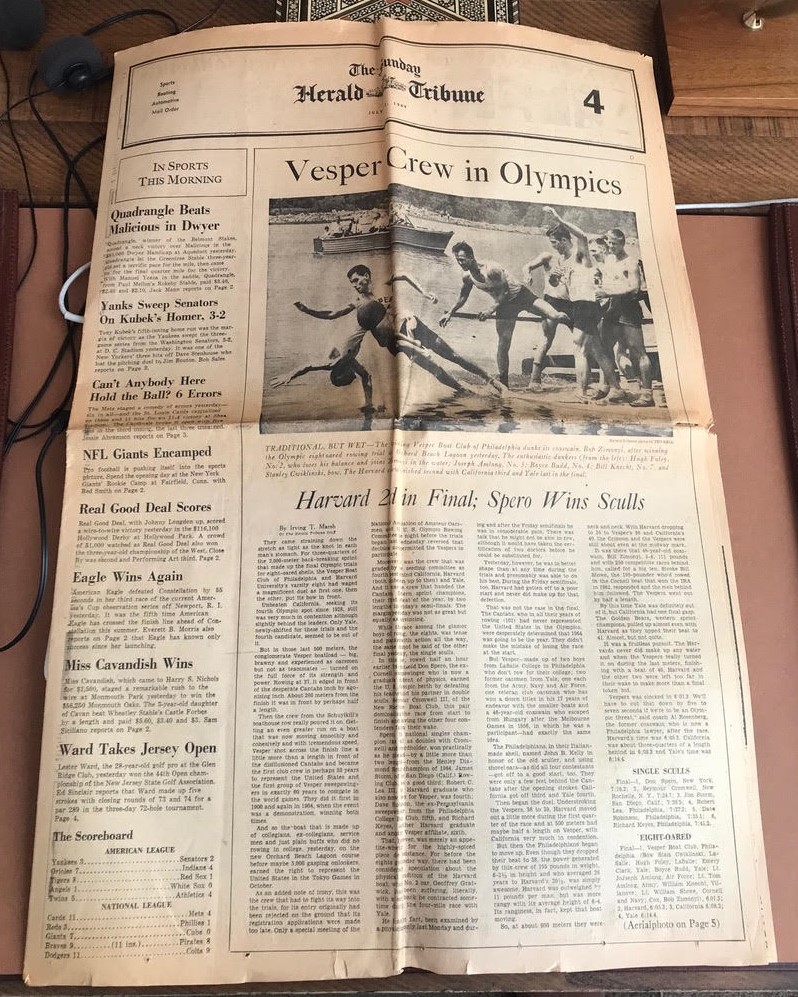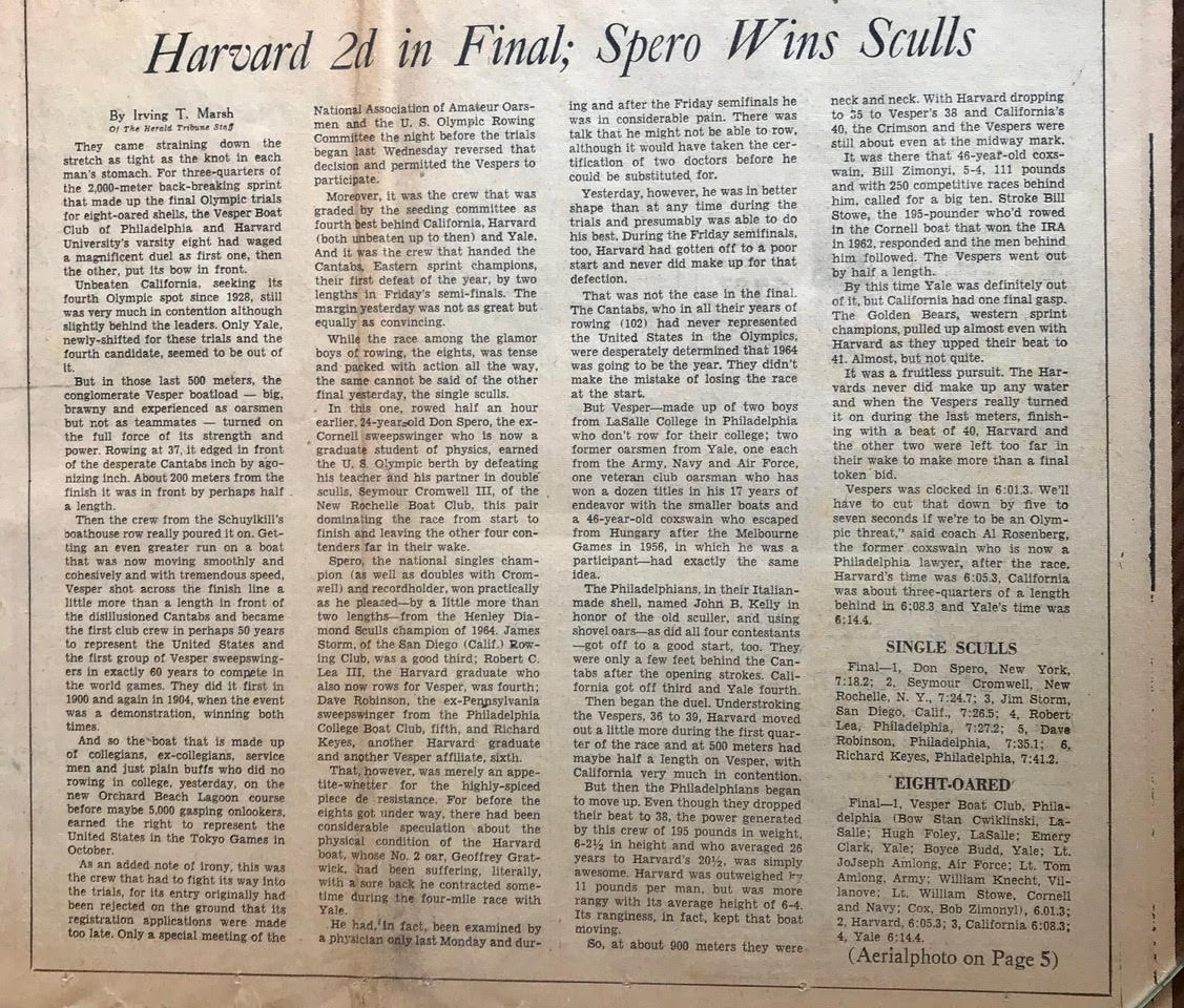I was twelve years old at those Orchard Beach Trials. I watched my older brother row in the Harvard eight that lost to Vesper. I was heartbroken for him and frankly, myself. Had they won my parents planned to take us all to Tokyo to watch. As it was he did compete at Tokyo in the 4+ for the US and was the youngest oarsman in the US team. Two years later I started rowing under a coach who had been (coincidentally) the youngest member of the American gold medal winning eight forty years earlier at the 1924 Paris Olympics.