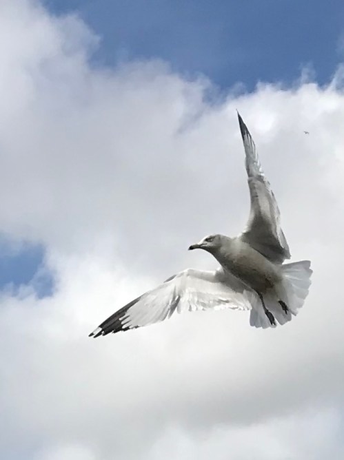 a seagull flew low above the water,