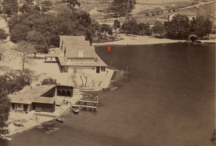 The spot (marked ‘x’) where the women’s rowing crew were pictured in 1867. This photograph was taken two years earlier.
