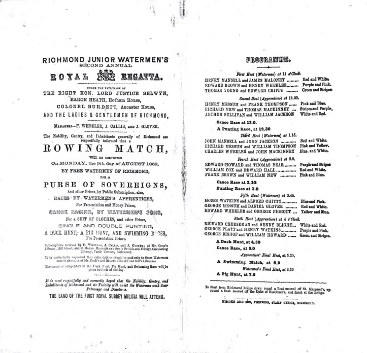 Assuming the report is reliable, the Prince of Wales in 1776, would have been George, later George IV. His birthday was 12 August – a very suitable time of year for a regatta. The reference to royal attendance at a regatta is interesting, because in the archives of the present-day Richmond Amateur Regatta is a programme printed on silk for the “Second Annual Richmond Junior Watermen’s Royal Regatta” which “respectfully informs … The Nobility, Gentry and Inhabitants generally of Richmond … that a ROWING MATCH will be contested on Monday, the 9th day of August 1869 BY FREE WATERMEN OF RICHMOND”.