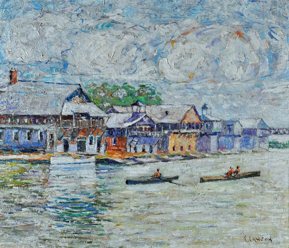 Way back in August 2012, I was the successful bidder of a painting signed by, but only attributed to, Ernest Lawson (1873-1939), noted member of “The Eight”. The subject matter, a single and double rowing on a river lined by a row of six vintage boathouses, appealed to me even more than the artist. In fact, my initial attempts to authenticate the painting met with considerable resistance from the so-called experts, not surprising considering the very modest “hammer” price, and the legal and ethical implications of determining the true authorship of artworks. I know, having co-edited The Frank E. Schoonover Catalogue Raisonné.