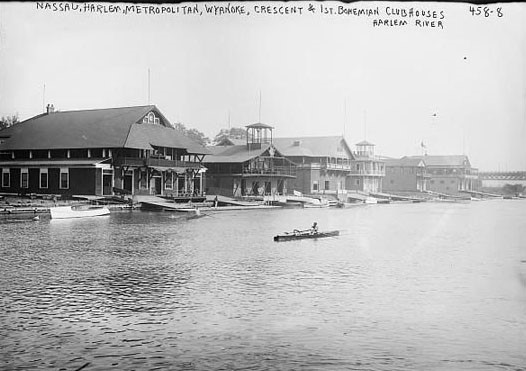 Sadly, Scullers’ Row became a victim of urban redevelopment beginning in 1902. Several clubs moved to the Macomb’s Dam Park, but, in 1937, they succumbed to Robert Moses’s preference for public tennis courts instead of “exclusive” clubs. Ironically, the area along the confluence of Sherman Creek and the Harlem River became an environmental nightmare until recent efforts in early 2000 reclaimed the area, now designated Sherman Park. Fortunately, it resulted in the revival of rowing at the new Peter Jay Sharp boathouse, the first Community boathouse of its kind on the river in more than 120 years.