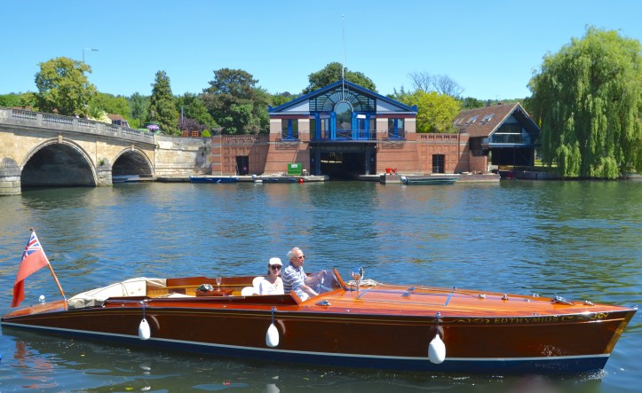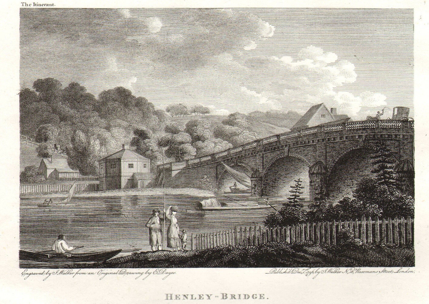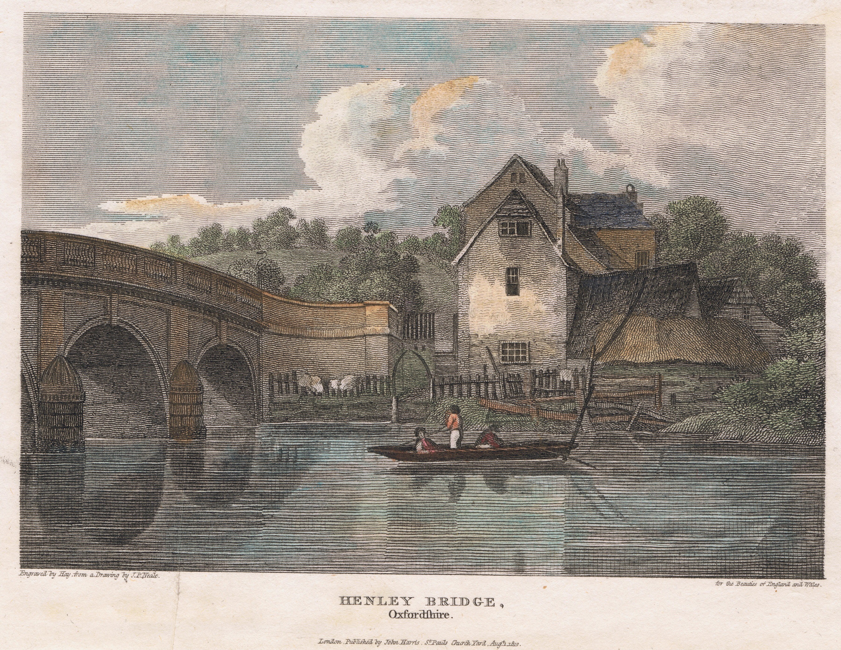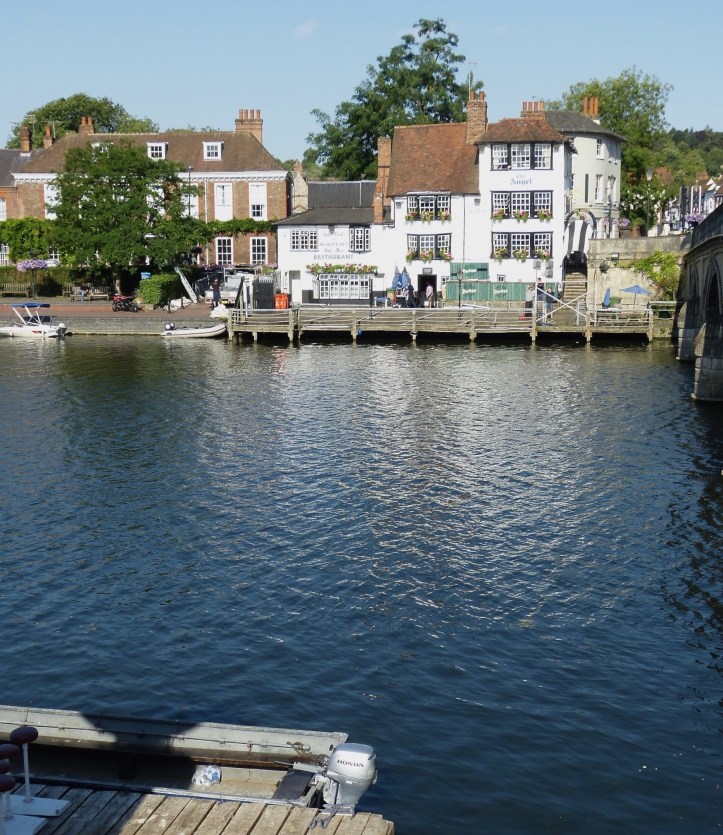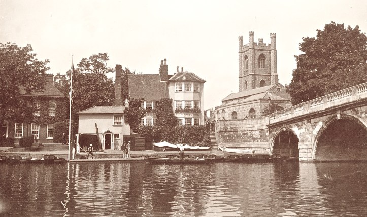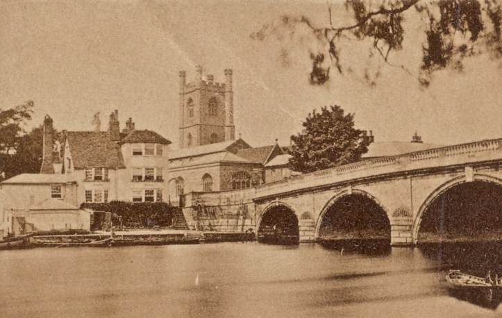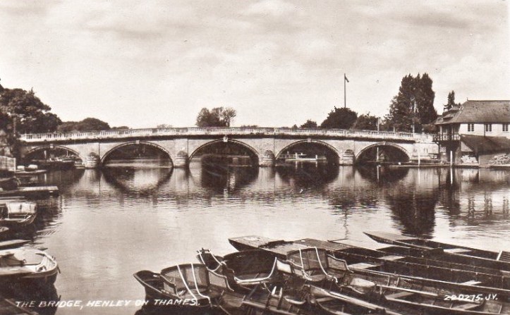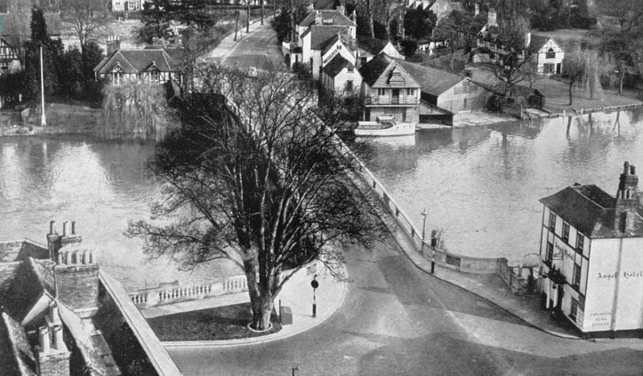 The ‘Carpenters Arms’ on the ‘Enclosure’ or ‘Berkshire’ side in 1812. The pub stood between 1714 and 1984 when it was demolished to make way for the new Regatta Headquarters.A postcard from the 1930s. The boathouse attached to the ‘Carpenters Arms’ can be seen on the right.A view from St Mary’s church tower, 1954. The ‘Carpenters Arms’ and its boathouse is on the right of the bridge as viewed here and, between the downstream side of the bridge and the Leander clubhouse, is a ‘mock Tudor’ house that was replaced by the existing bungalow in the 1960s.A view of the ‘Carpenters Arms’ from the bridge, 1897.The Regatta Headquarters, 2018.This 1811 view of ’The Angel on the Bridge’ on the ‘Town’ or ‘Oxfordshire’ side has changed remarkably little since the pub was built in 1728.18341858187119012018