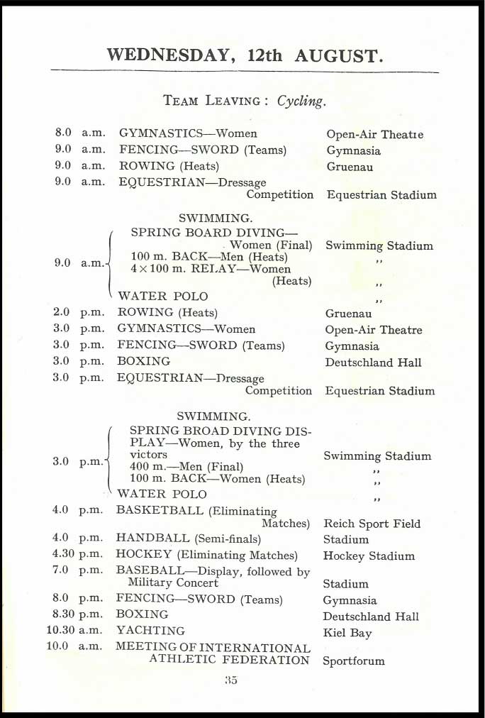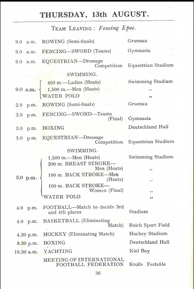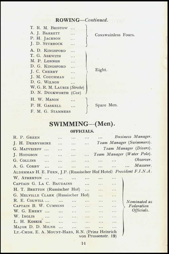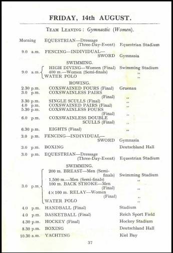 BOA page 37 – On Friday 14 August was the rowing finals. That these lists were not made by an oarsman is obvious: ‘6 p.m. is the final for Coxswainless Double Sculls’!