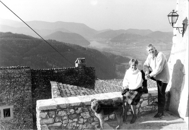 Ingmarie and Thor Nilsen with Glocky in Labro, overlooking the lake at Piediluco. Photo from “Thor Nilsen: Rowing’s Global Coach”.