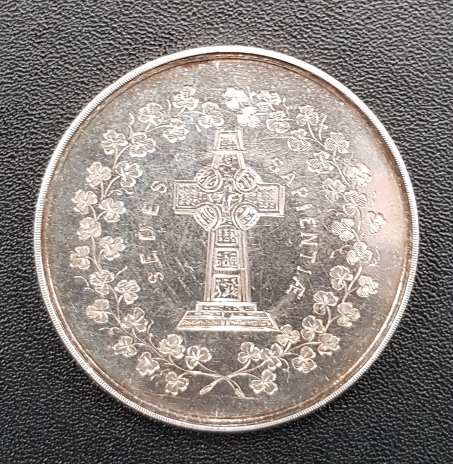 The medal weighs 35 grams and the seller had it professionally troy tested in three different areas, and each indicated sterling silver. The obverse is engraved with a Celtic High Cross and the motto SEDES SAPIENTIÆ surrounded by a garland of shamrocks. The reverse identifies the club and its crew and dates the medal to June 1861.