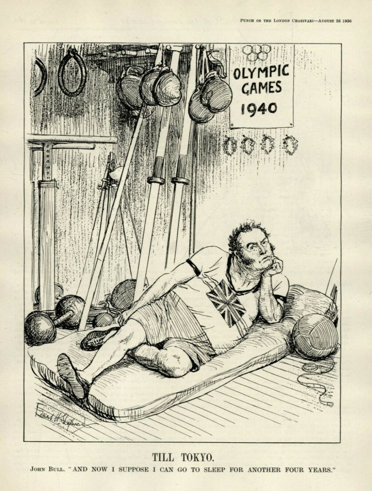 In the Punch cartoon above from 26 August 1936, the personification of the UK (or England), the stoutly-looking John Bull – here without his tailcoat, breeches and top hat, but with a Union Jack shirt, shorts and a pair of cleats – is calmly awaiting the Olympic Games in Tokyo: ‘And now I suppose I can go to sleep for another four years’.