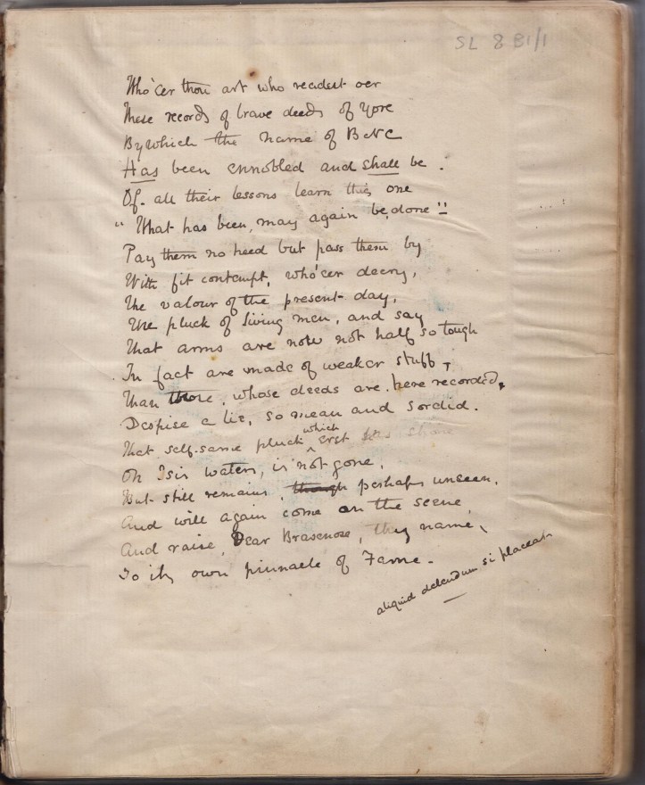 My favourite page is not the glorious frontispiece to the first Minute Book, shown above, but the poem which follows. Although Brasenose had been Head of the River in Oxford at least five times between 1815 and 1827, their fortunes had been parlous for much of the decade before the first Minute Book opened in 1837. In one of these years they failed to put on a boat at all.
